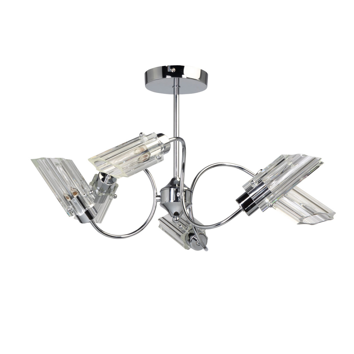 Металлическое основание потолочной люстры гальванизировано в цвет хрома. Люстра декорирована прозрачными фактурными стеклянными плафонами вытянутой формы.