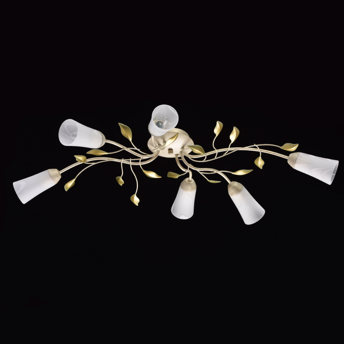 Основание: металл, окрашивание по технологии хай-лайт, основной цвет - белый, декоративный слой цвета золота. Рожки и завитки выполнены по технологии проката на роликовом станке. Плафоны: стекло отлитое в форму, матирование, ручное окрашивание по поверхности.Декор: растительные элементы из металла, окрашивание в салатовый цвет.