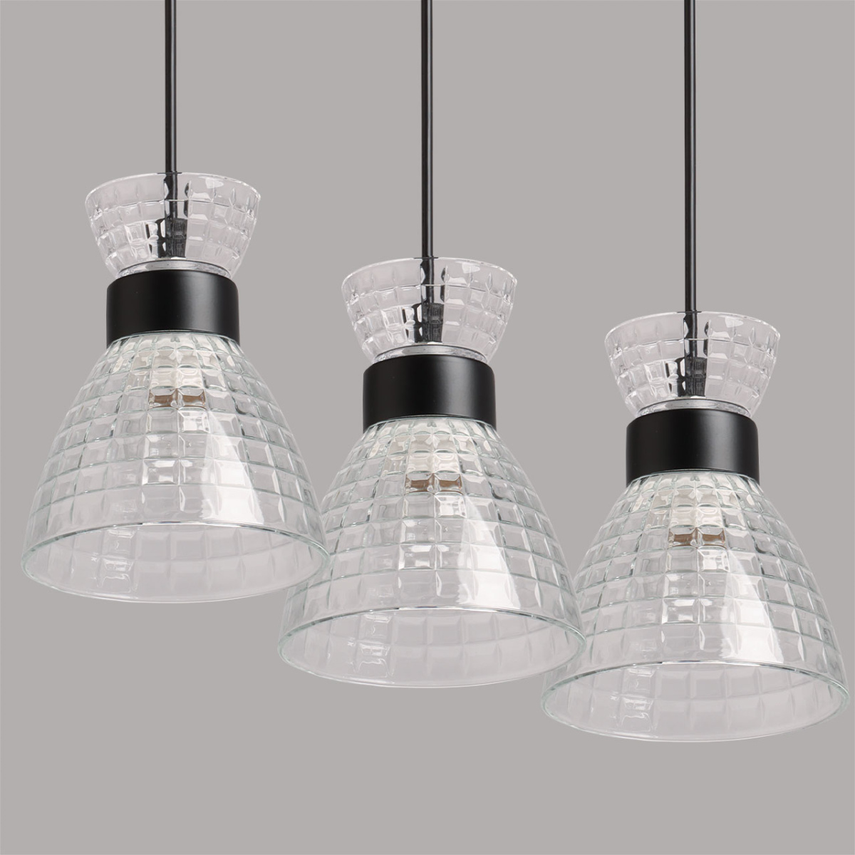 Металлическое основание люстры окрашено в черный цвет. Прозрачные стеклянные плафоны с геометричной фактурой отлиты в сложную форму.
