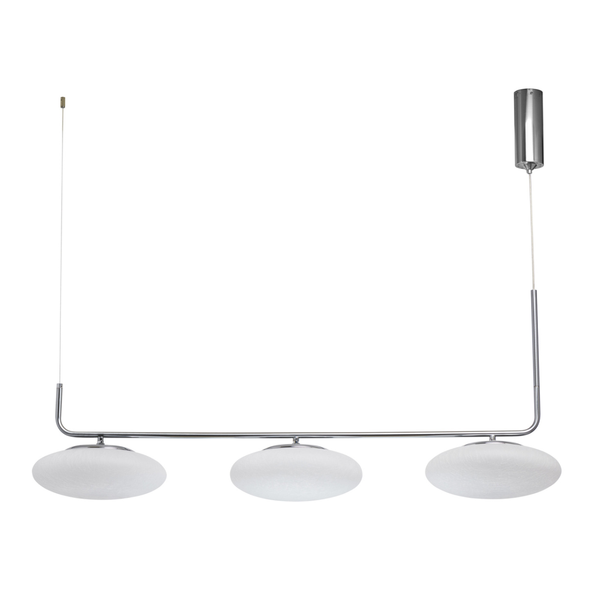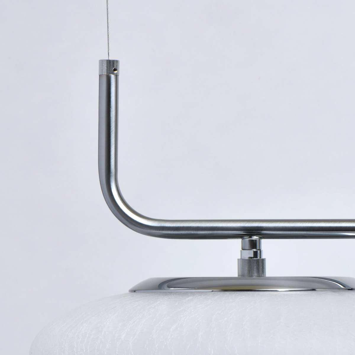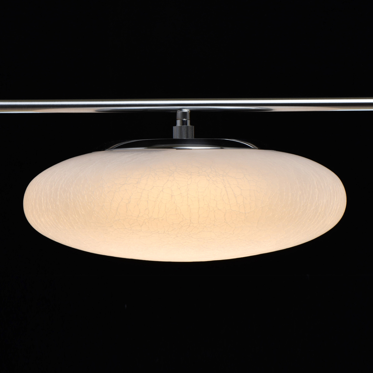 Основание светильника выполнено из металла и гальванизировано в цвет матового хрома. Плафоны выдуваются в форму и обработаны по технологии кракелирования и матирования.