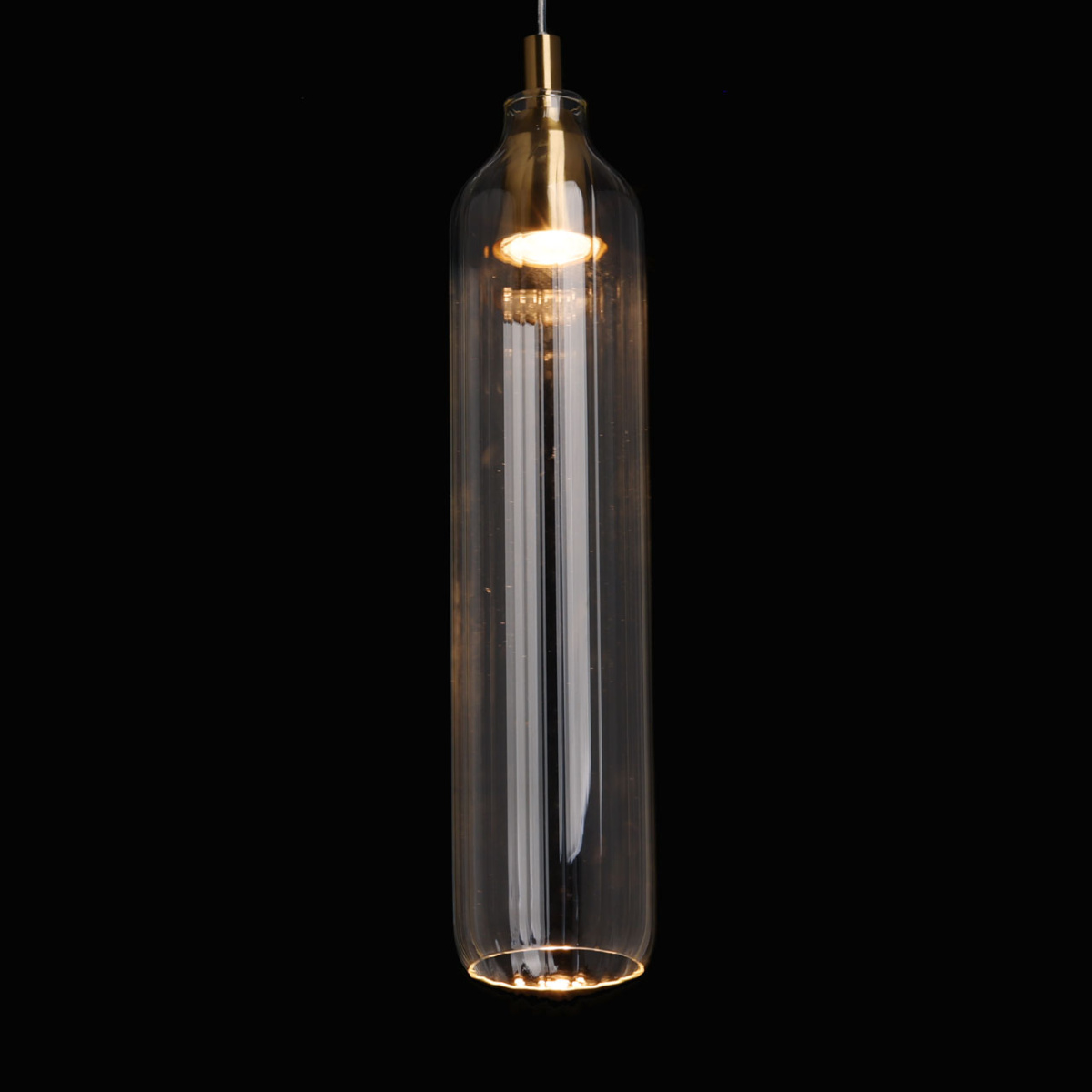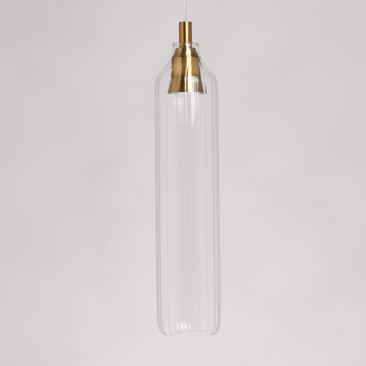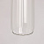 Металлическое основание подвеса гальванизировано в цвет латуни. Плафон вытянутой формы отлит из прозрачного стекла.