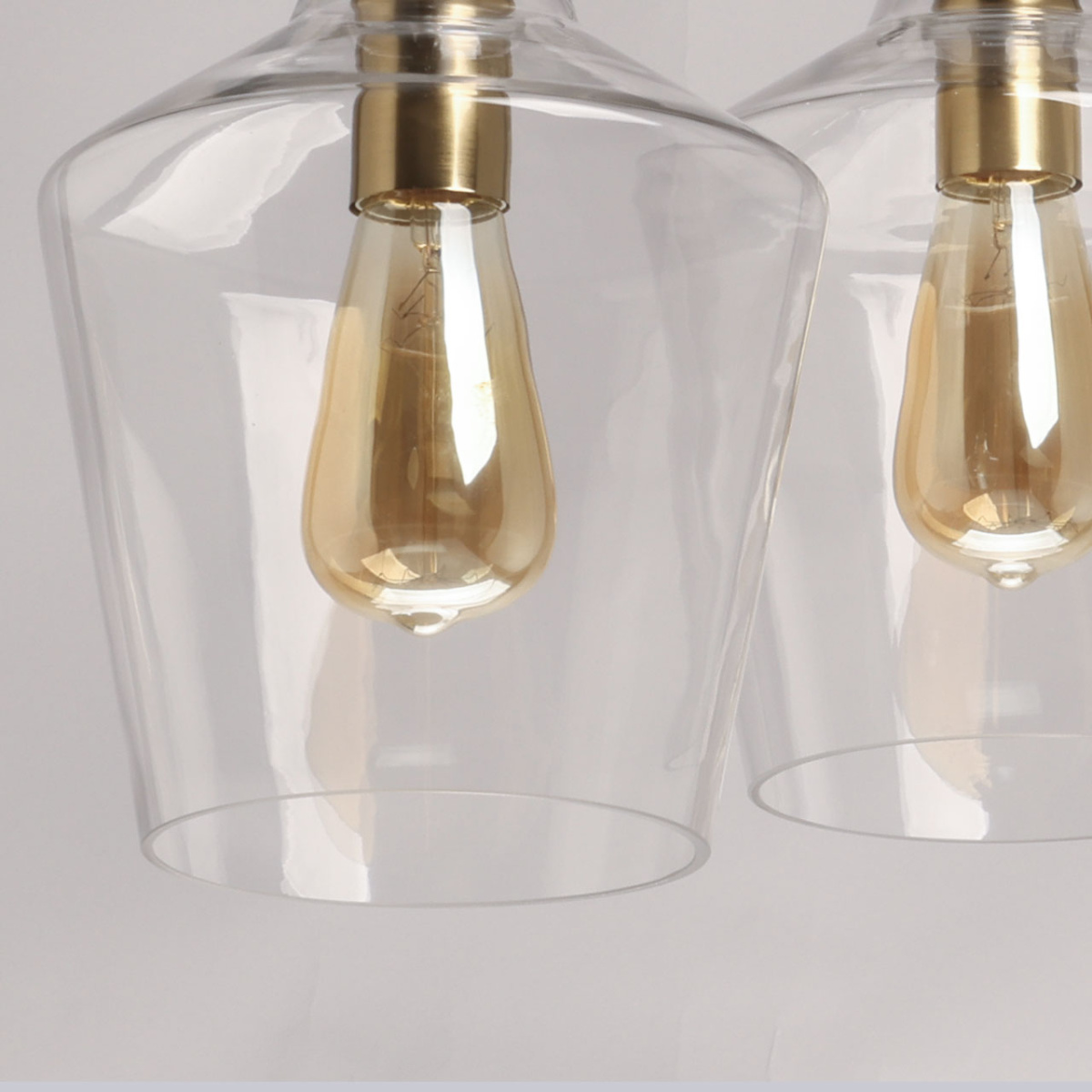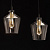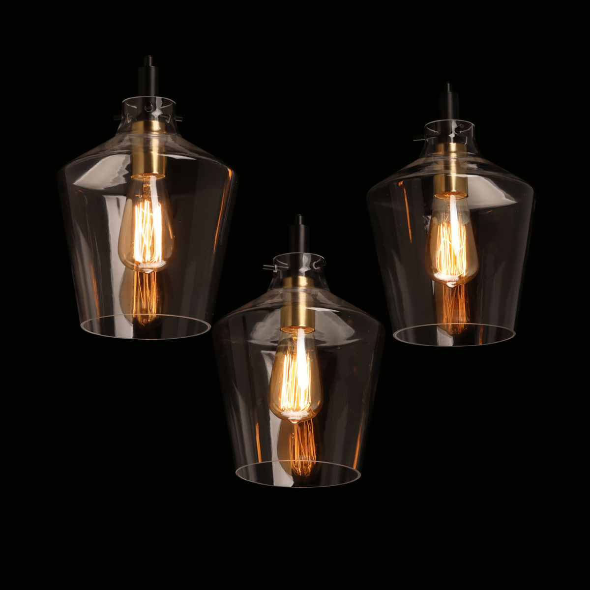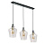 Металлическое основание подвесной люстры окрашено в черный цвет. Отдельные элементы основания гальванизированы в цвет латуни. Прозрачные стеклянные плафоны отлиты в сложную форму.