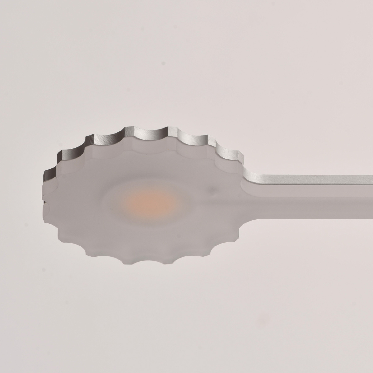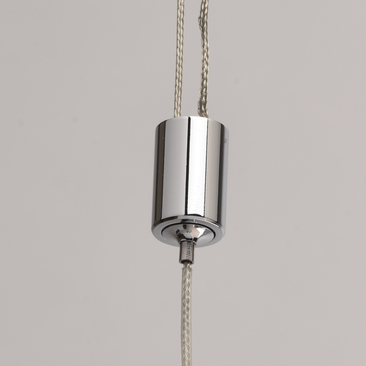Основание выполнено из нержавеющей стали. Плафон выполнен из сплава аллюминия, круглые источники света типа СОВ закрыты белым матовым акрилом. Подвес - металлические троссы.