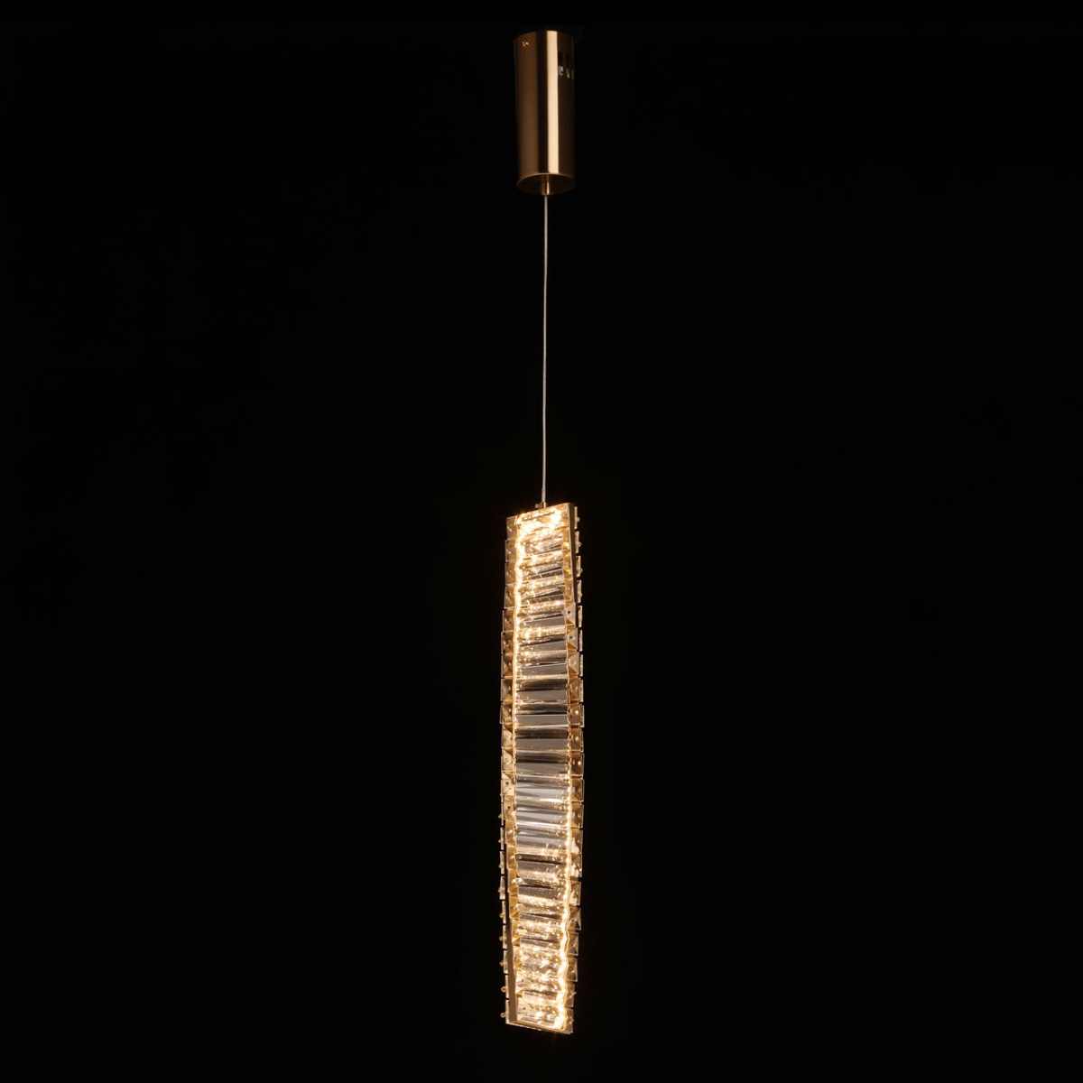 Металлическое основание подвесной люстры гальванизировано в цвет латуни. Люстра декорирована прозрачным хрусталем.