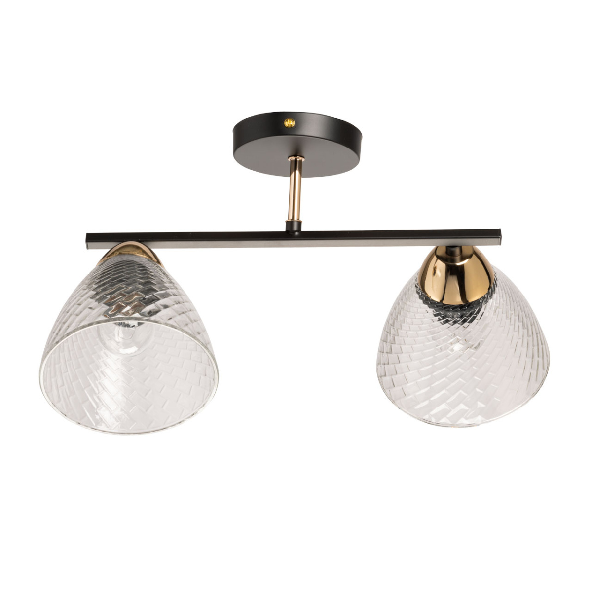 Металлическое основание потолочной люстры окрашено в черный цвет. Отдельные элементы основания гальванизированы в цвет золота. Потолочный светильник декорирован плафонами из прозрачного фактурного стекла.