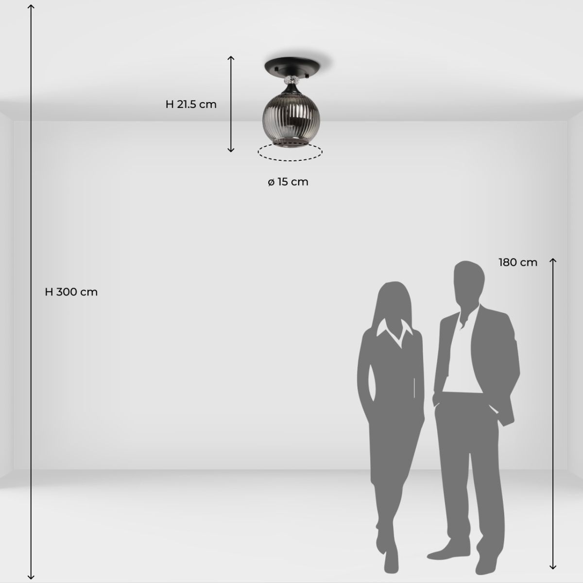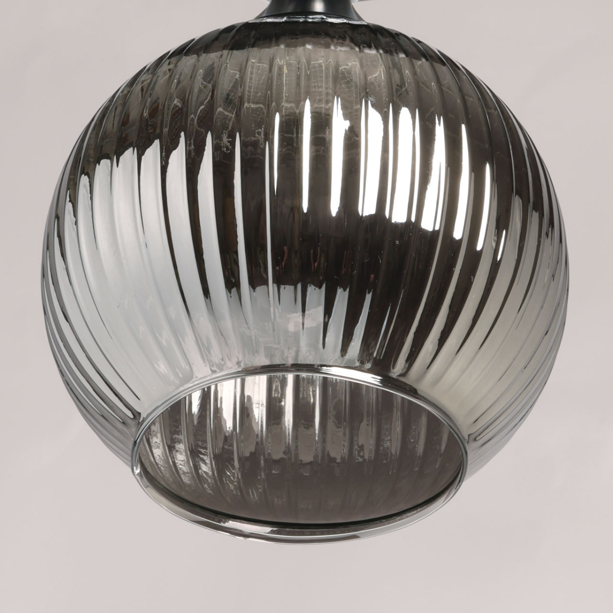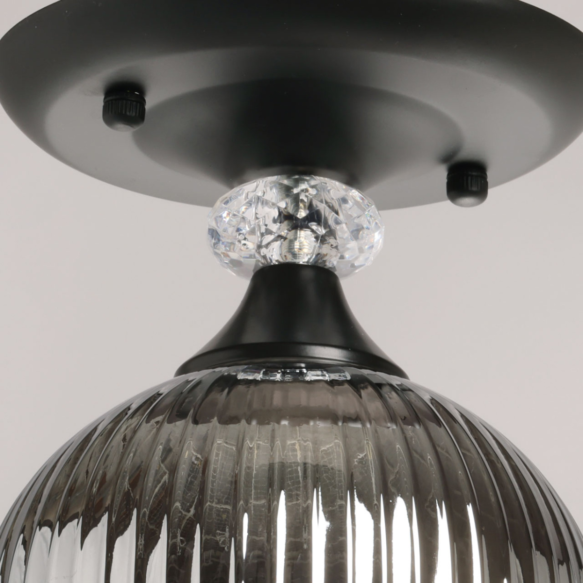 Металлическое основание светильника окрашено в черный цвет. Стеклянный плафон отлит в сложную форму и гальванизирован в дымчатый цвет. У основания светильник декорирован прозрачным хрусталем.