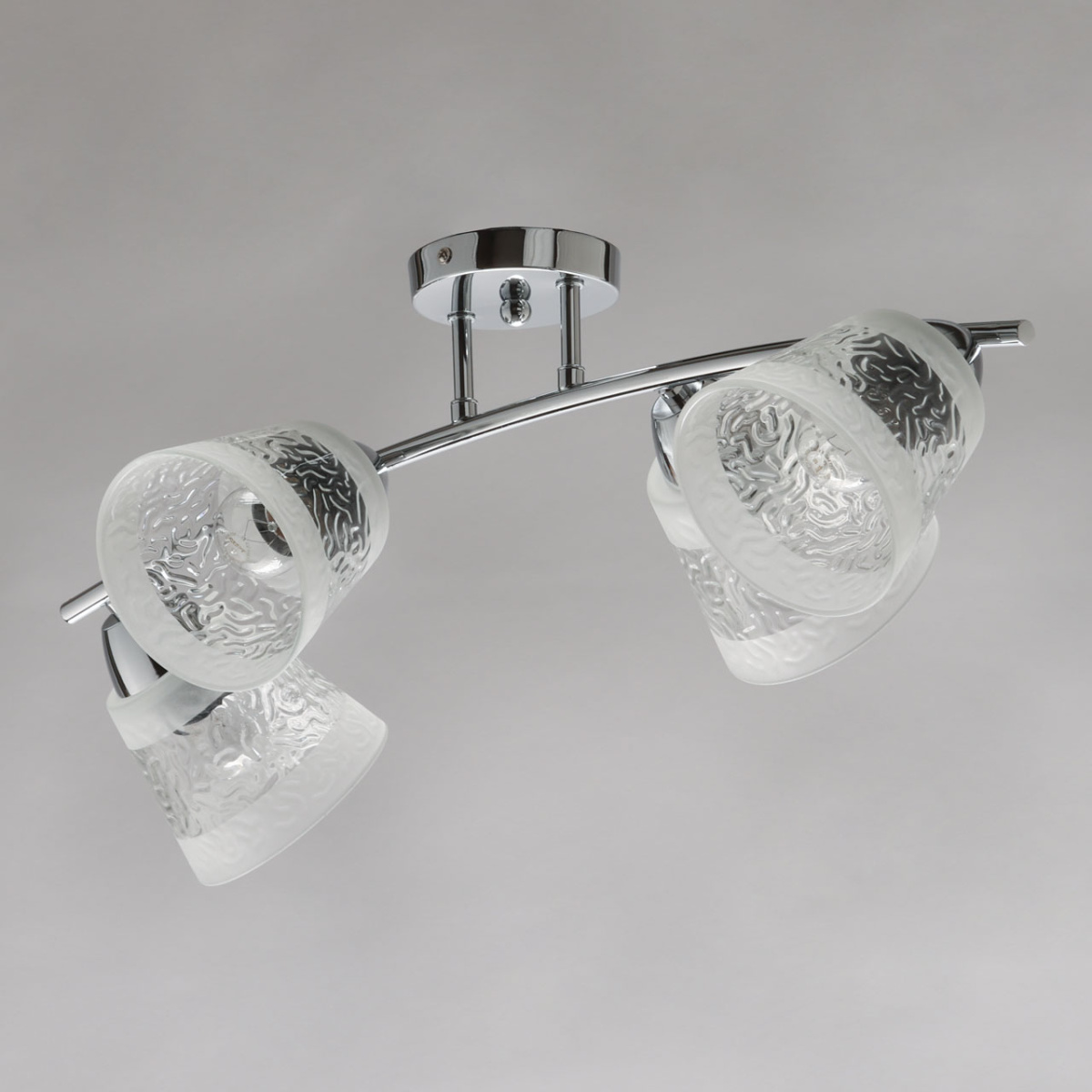 Металлическое основание потолочной люстры гальванизировано в цвет хрома. Стеклянные фактурные плафоны матированы по трафарету.