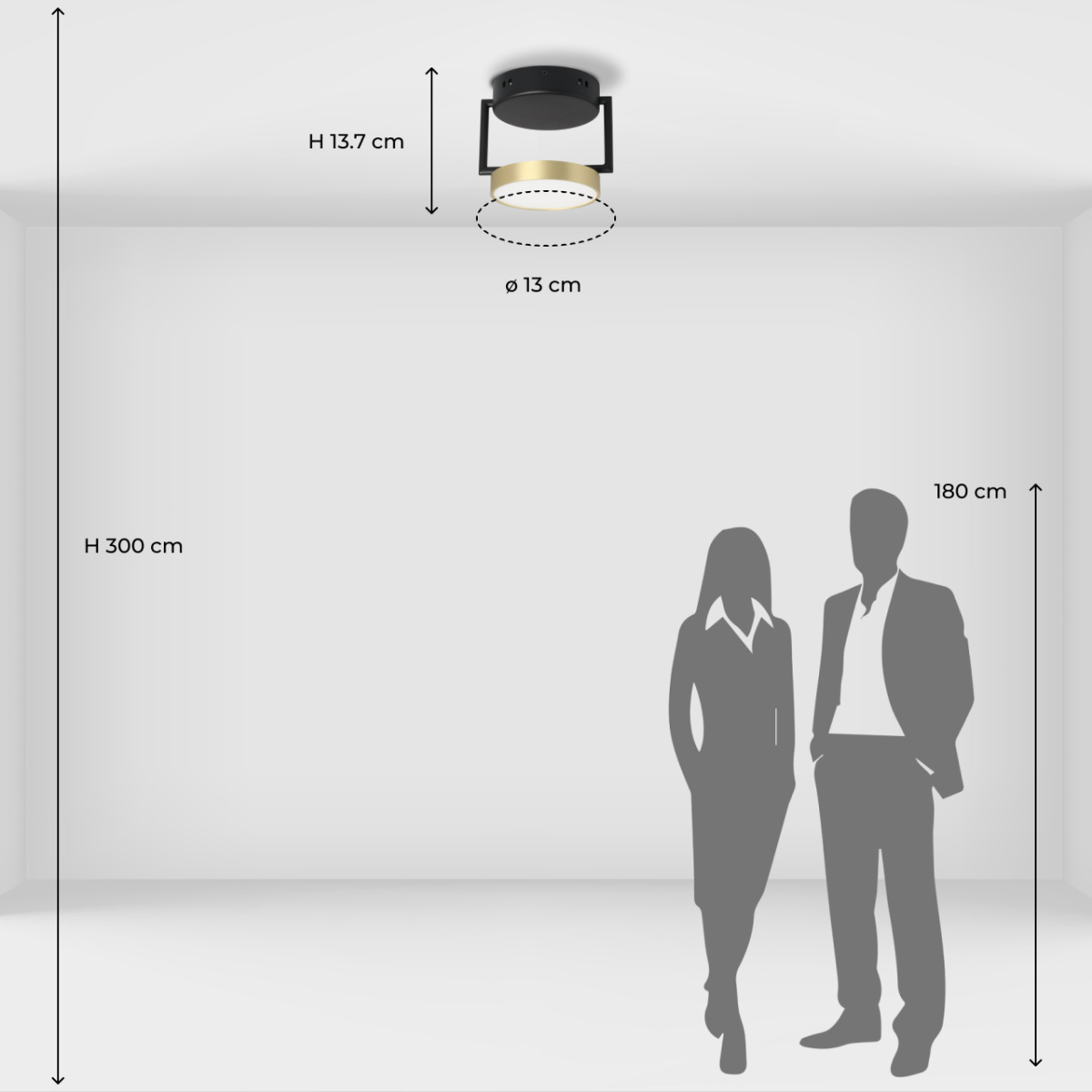 Металлическое основание потолочного светильника обработано по технологии порошкового окрашивания в черный цвет. Корпус плафона гальванизирован в цвет золота. Светодиодные источники света закрыты белым матовым акрилом.