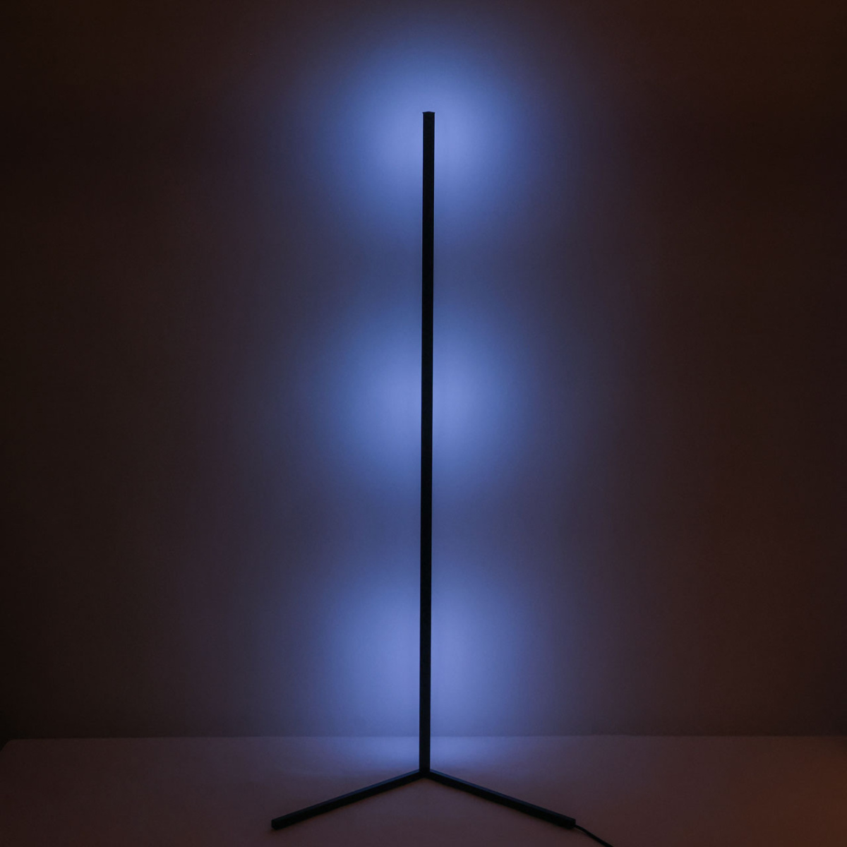 Металлическое основание торшера окрашено в черный цвет. Корпус плафона выполнен из сплава алюминия и окрашен в цвет основания. Светодиодный источник света RGB закрыт белым матовым акрилом. В комплект входит пульт.