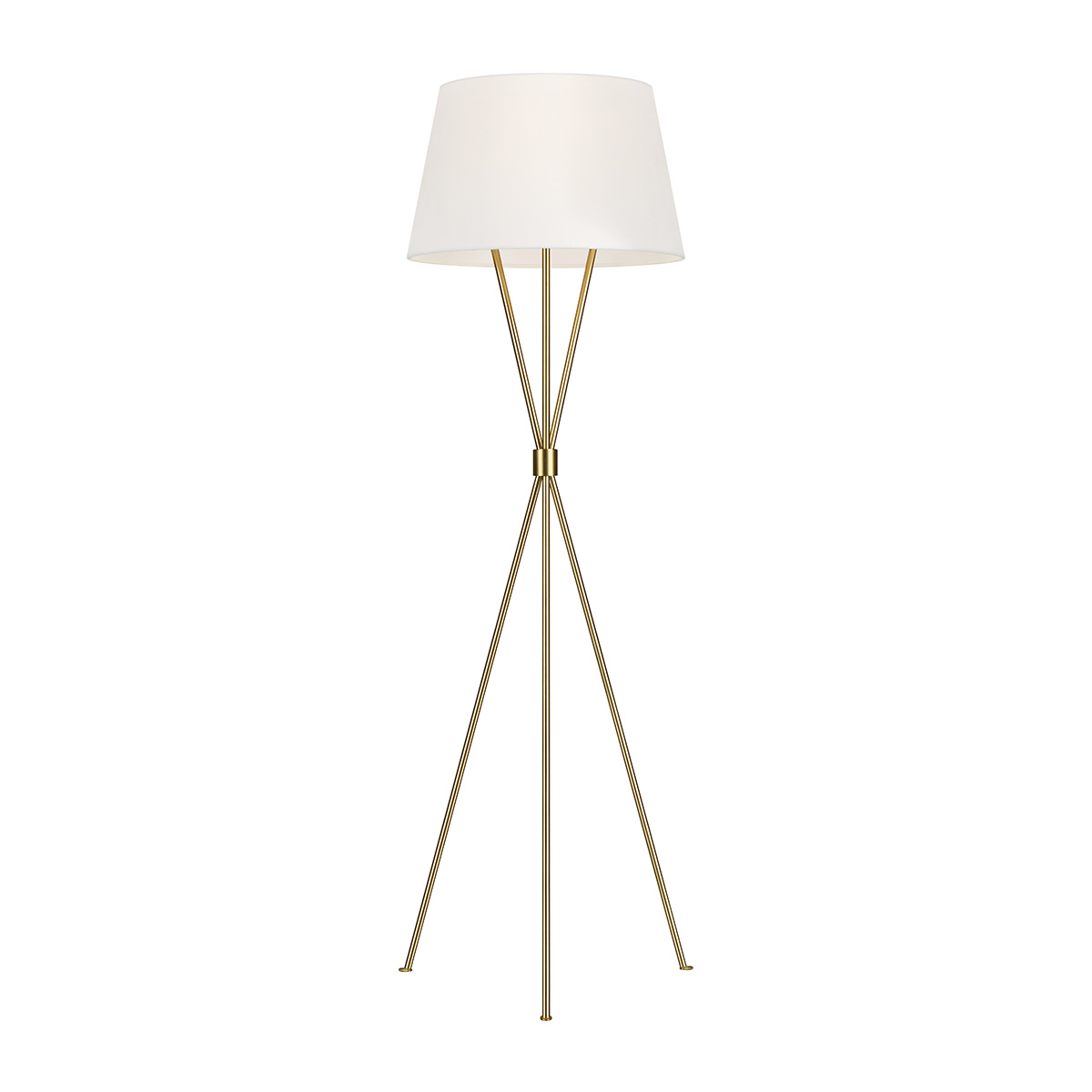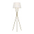 Основа-тренога в стиле середины ХХ века. Удлинённые ножки пересекаются в заданной точке. Абажур «белый лён». Покрытие «полированная латунь», «состаренное железо» и «полированный никель».