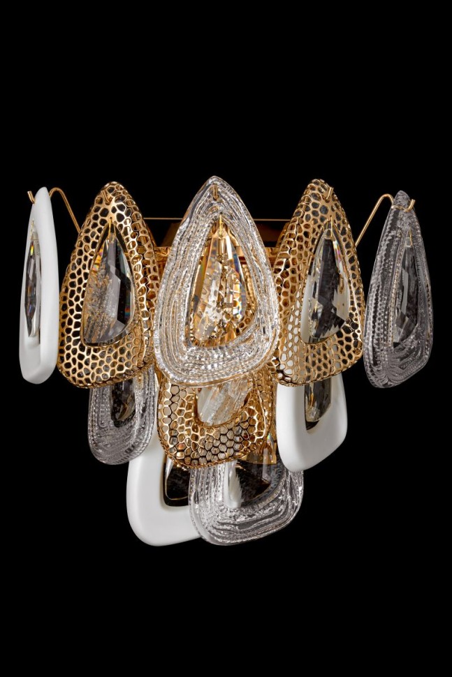 В переводе с итальянского название коллекции – «тонкость, изящество». Оно точно отражает утонченный характер дизайна светильников. Декоративные элементы плафонов выполнены в виде крупных капель из керамики и хрусталя высшего качества. Вместе они создают гармоничную элегантную композицию. Арматура светильников – из металла с гальваническим покрытием золотого цвета. Коллекция представлена люстрами различных размеров и форм и настенным светильником.
