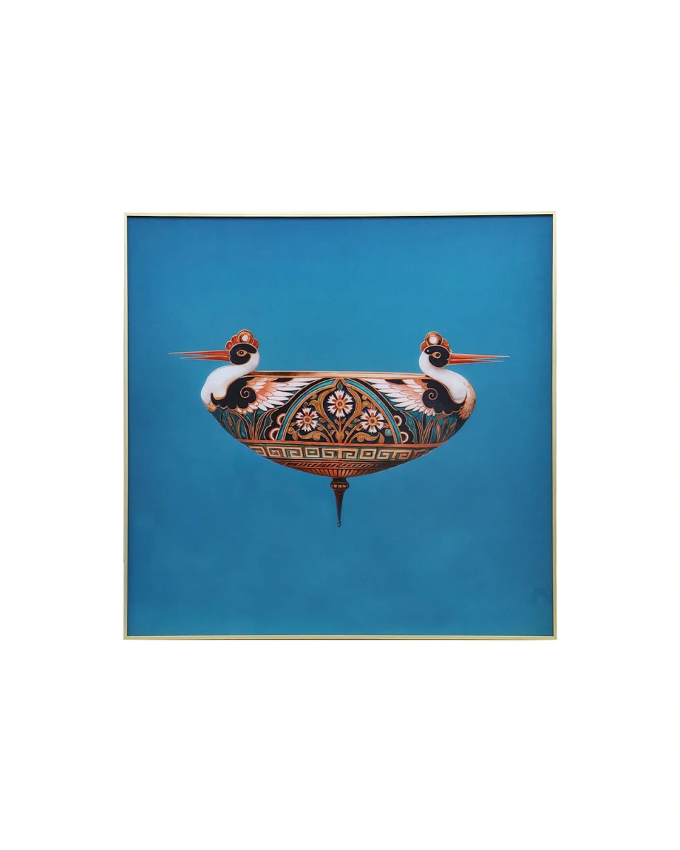 Интерьерная картина "Митци" — выразительное декоративное полотно с символическим сюжетом. На насыщенном синем фоне изображена стилизованная форма, напоминающая сосуд с элементами традиционного орнамента. Её очертания напоминают силуэты птиц: по обеим сторонам композиции читаются головы с клювами, направленные в разные стороны. Орнамент украшен цветочными и геометрическими узорами в тёплой палитре охры, чёрного и белого цветов. Симметрия и сбалансированность композиции сочетаются с ярким контрастом цвета и декоративной детализацией, делая картину выразительным акцентом. "Митци" органично впишется в современный, эклектичный или этно-интерьер, привнося в него художественную глубину и колористическую насыщенность.