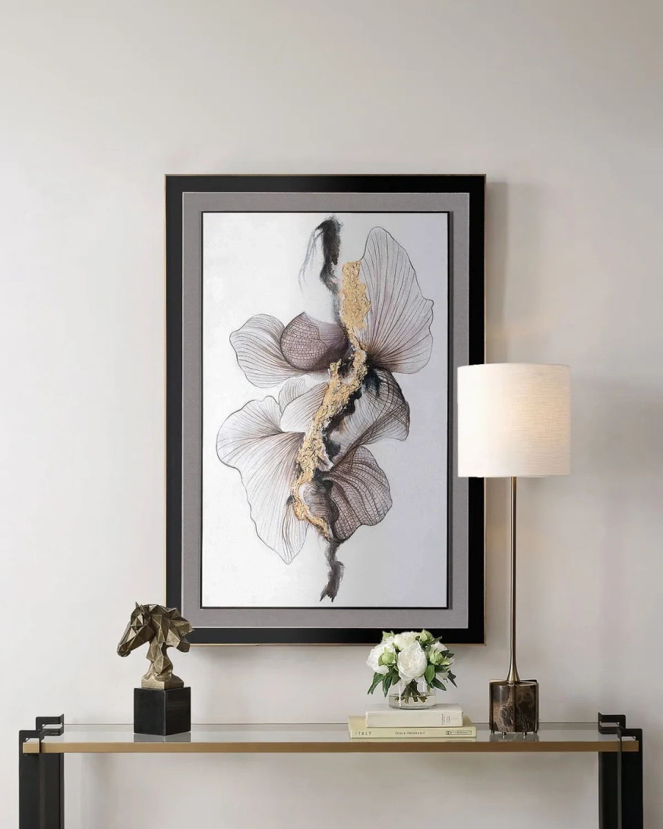 Интерьерная картина "Selenophile" – это произведение в стиле современного абстракционизма с элементами минимализма. Композиция напоминает два цветка или плавные линии лепестков с тонкими прожилками, создавая ощущение лёгкости и гармонии. Центральный акцент картины – золотистая текстура, придающая эффект разлома или движения энергии, что отсылает к японскому искусству кинцуги – философии восстановления и преображения. Картина выполнена в сдержанной палитре оттенков серого, чёрного и золота, что делает её элегантной и универсальной. Она станет стильным акцентом в интерьере, будь то гостиная, спальня, кабинет или офис.