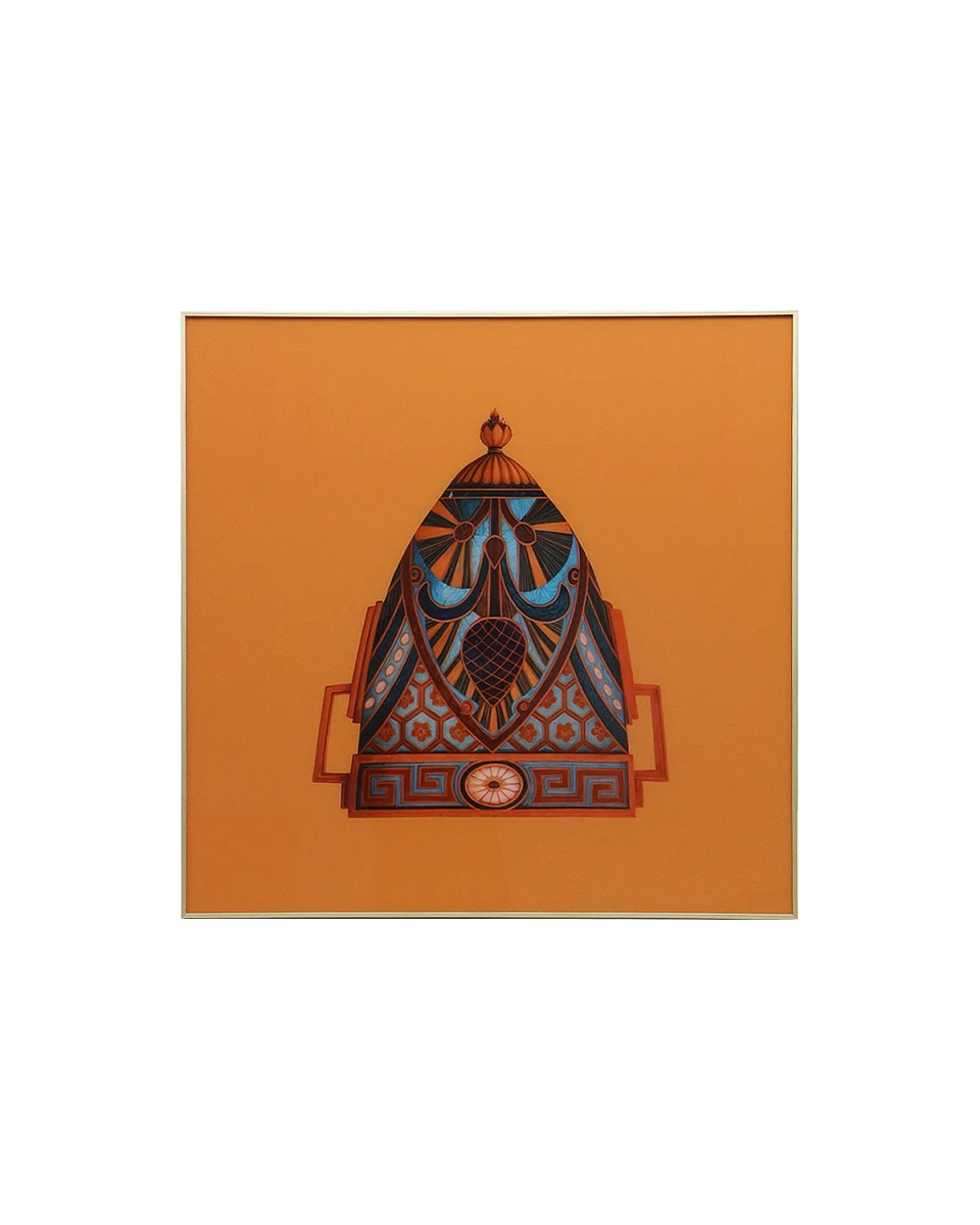 Интерьерная картина "Ванг" выполнена в ярком и выразительном стиле с преобладанием оранжевых, синих и тёмно-красных тонов. Центральным элементом композиции является стилизованный архитектурный мотив, напоминающий восточный храм или шлем, украшенный геометрическими и орнаментальными узорами. Картина сочетает в себе элементы ар-деко и этнического дизайна, создавая впечатление богатства и утончённости. Она станет ярким акцентом в интерьере, особенно в пространстве с минималистичной или эклектичной обстановкой.