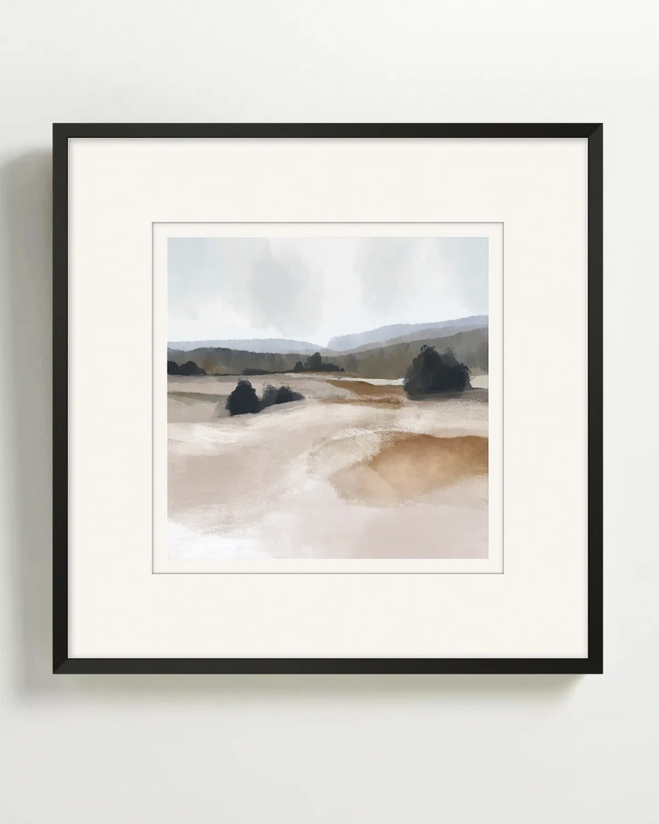Квадратный постер "The Ranch" - это минималистичный и абстрактный пейзаж, выполненный в мягких, естественных тонах. На этом произведении изображён приглушённый сельский ландшафт с оттенками песочного, кремового и коричневого цветов, плавно переходящими друг в друга. Затемнённые силуэты кустов или деревьев создают контраст и добавляют глубину, а дальние холмы растворяются в дымке, создавая атмосферу спокойствия. Такие постеры часто используются в современном интерьерном дизайне благодаря их сдержанной цветовой палитре и гармоничному сочетанию с разными стилями оформления.