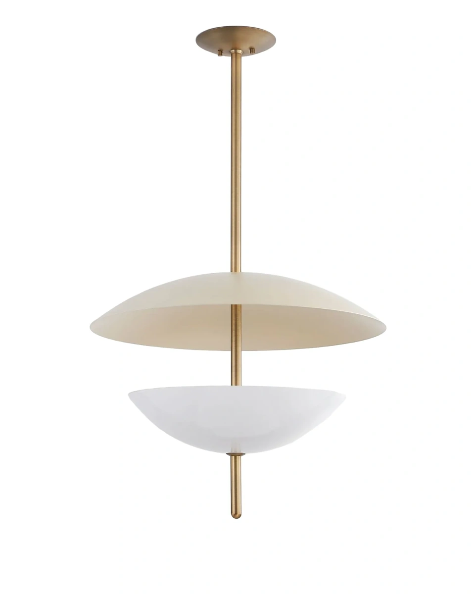 Золотистый подвесной светильник "Чинцио" — элегантный акцент для интерьеров в стиле modern classic, soft contemporary и mid-century. Его выразительная двухслойная форма создаёт мягкое, рассеянное освещение и подчёркивает архитектуру пространства, верхний широкий металлический диск формирует выразительный силуэт, а нижняя полусфера из стекла мягко рассеивает свет и делает освещение комфортным. Светильник выполнен в отделке из брашированной латуни, которая придаёт модели тёплый оттенок. Плафон в цвете белый и слоновая кость гармонично сочетает стекло и металл, обеспечивая комфортный свет без резких бликов. Центральная ось из металла подчёркивает симметрию и делает дизайн визуально сбалансированным. Благодаря диаметру Ø 60 см и общей высоте 50,6 см светильник отлично подходит для размещения над обеденным столом, в гостиной или зоне кухни-столовой. Использование LED-лампы обеспечивает энергоэффективность и современный уровень освещения.