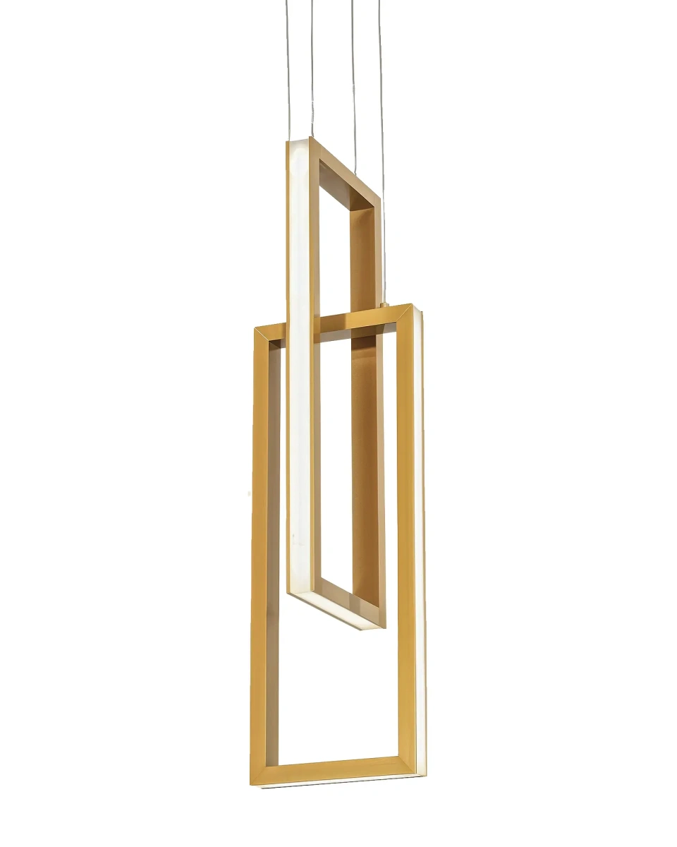 Золотой светодиодный подвес "Ульрих" сочетает в себе лаконичность и простоту дизайна, который состоит из двух прямоугольных форм, создающих геометрическую фигуру и придают ей современный вид. Встроенные светодиодные модули расположены вдоль внешнего края каждого прямоугольника, обеспечивая яркое и равномерное освещение. Золотой светодиодный подвес "Ульрих"доступен в  трех вариантах цвета: чёрном, латунь и никель. Металлическая рама и покрытие в цветовой гамме - латунь, придают люстре стойкость к внешним воздействиям и сохраняют ее изначальный внешний вид на протяжении длительного времени. Одной из главных преимуществ этой люстры заключается в ее энергоэффективности. Благодаря использованию светодиодных модулей, эта люстра потребляет значительно меньше электроэнергии, чем обычные осветительные приборы. Это не только экологичное решение, но и экономически выгодное. Светодиодные модули имеют длительный срок службы и требуют минимального обслуживания, что позволяет сэкономить время и деньги на замене лампочек. Золотая люстра “Ульрих” является идеальным дополнением к современному интерьеру. Она будет выглядеть прекрасно в гостиной, столовой или спальне. С ее помощью вы сможете создать эффектное и яркое освещение, которое станет настоящим украшением вашего дома!
