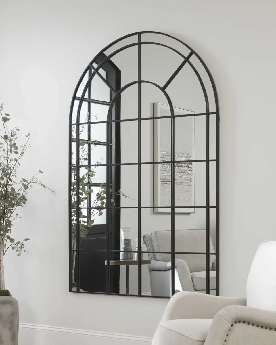 Чёрное зеркало в форме окна "Бишоп" - это арочное зеркало в форме окна, выполненное из прочного металлического каркаса и окрашенное в элегантный черный цвет. Благодаря своей форме и стилю, это зеркало прекрасно сочетается с различными стилями интерьера, от современного до классического. Но настоящая красота зеркала "Бишоп" раскрывается в множественном использовании. Установив несколько зеркал рядом на большой стене, вы создадите потрясающую композицию, которая добавит глубину и объем вашему пространству. Такие композиции зеркал становятся не только декоративной особенностью в вашем доме, но и отражают свет, создавая визуальную игру и сияние. Оно идеально подходит для использования в гостиной, спальне, прихожей.