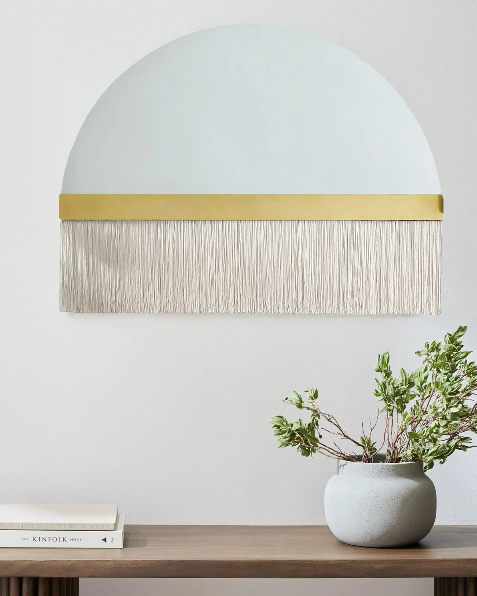 Декоративное зеркало "Арья" с белой бахромой - это элегантное и стильное дополнение для любого интерьера. Оно имеет форму полукруга, что добавляет некоторую оригинальность и интерес к его дизайну. Прямоугольный акцент в цветовой гамме - латунь, создает контраст и дополняет его элегантность. Но главное преимущество этого зеркала заключается в его особой детали – белых шелковистых нитях, вдохновленные стилем «бохо-шик», они мягко спускаются по периметру латунного акцента. Эти детали добавляют зеркалу легкость, текстуру и неповторимый шарм, подчеркивая его уникальный дизайн и привносят в пространство естественное чувство стиля, теплоту и уют, гармонично вписываясь в любую обстановку. Идеально подходит для гостиных, спален, прихожих, добавляя интерьеру изысканности и индивидуальности.