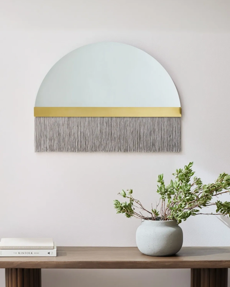 Декоративное зеркало "Арья" с серой бахромой - это элегантное и стильное дополнение для любого интерьера. Оно имеет форму полукруга, что добавляет некоторую оригинальность и интерес к его дизайну. Прямоугольный акцент в цветовой гамме - латунь, создает контраст и дополняет его элегантность. Но главное преимущество этого зеркала заключается в его особой детали – серых шелковистых нитях, вдохновленные стилем «бохо-шик», они мягко спускаются по периметру латунного акцента. Эти детали добавляют зеркалу легкость, текстуру и неповторимый шарм, подчеркивая его уникальный дизайн и привносят в пространство естественное чувство стиля, теплоту и уют, гармонично вписываясь в любую обстановку. Идеально подходит для гостиных, спален, прихожих, добавляя интерьеру изысканности и индивидуальности.