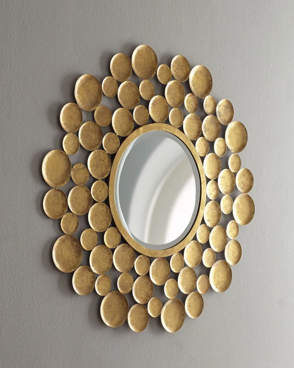 Зеркало интерьерное круглое "Вирджиния" - это стильный предмет декора, который привнесет оригинальность в ваш дом. Уникальная рама, составленная из множества металлических дисков различных размеров, придает этому зеркалу особый вид. Это зеркало подойдет для любого интерьера: его универсальный дизайн позволит использовать его как в современных, так и в классических помещениях. Поместите его в спальню, гостиную, прихожую или любое другое помещение, которое нуждается в дополнительном элементе декора, способном добавить характера. Зеркало также может визуально увеличить пространство и добавить света, особенно в небольших комнатах.