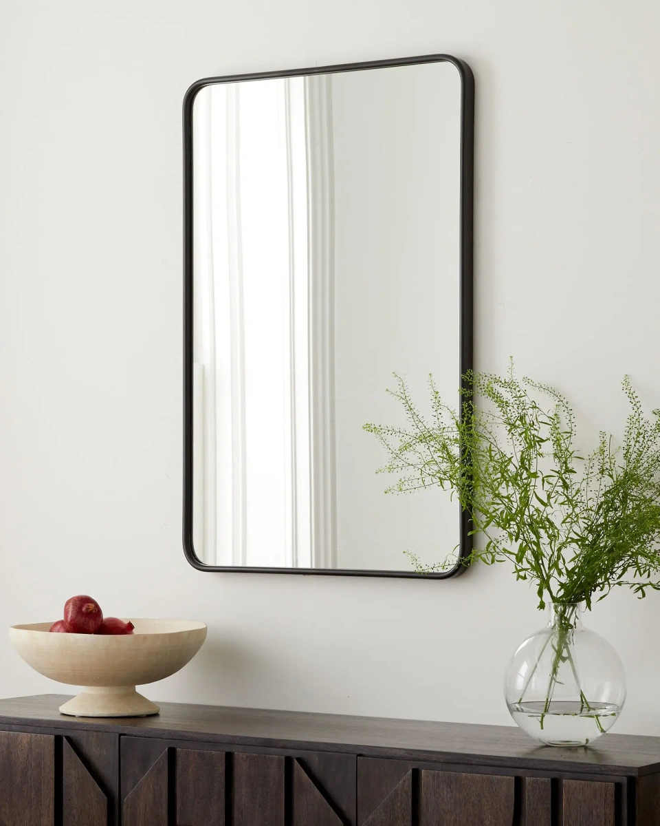 Зеркало в чёрной раме "Теони" - это идеальное дополнение к вашему интерьеру. Прямоугольная форма этого металлического зеркала с закругленными краями создает современный и сдержанный вид, который легко впишется в любую комнату. Это настенное зеркало является отличным выбором для прихожей или ванной. Чёрный цвет рамы придаёт зеркалу универсальность, что делает его прекрасным дополнением к современному интерьеру. Оно часто используется в прихожих, где может быть использовано для проверки своего внешнего вида перед выходом из дома. Зеркало также прекрасно подходит для ванной комнаты, особенно над раковиной. Оно не только функционально, позволяя вам удобно просматривать свое отражение, но и прекрасно дополнит дизайн ванной комнаты своим стильным и современным видом. Установка данного зеркала осуществляется только вертикально.