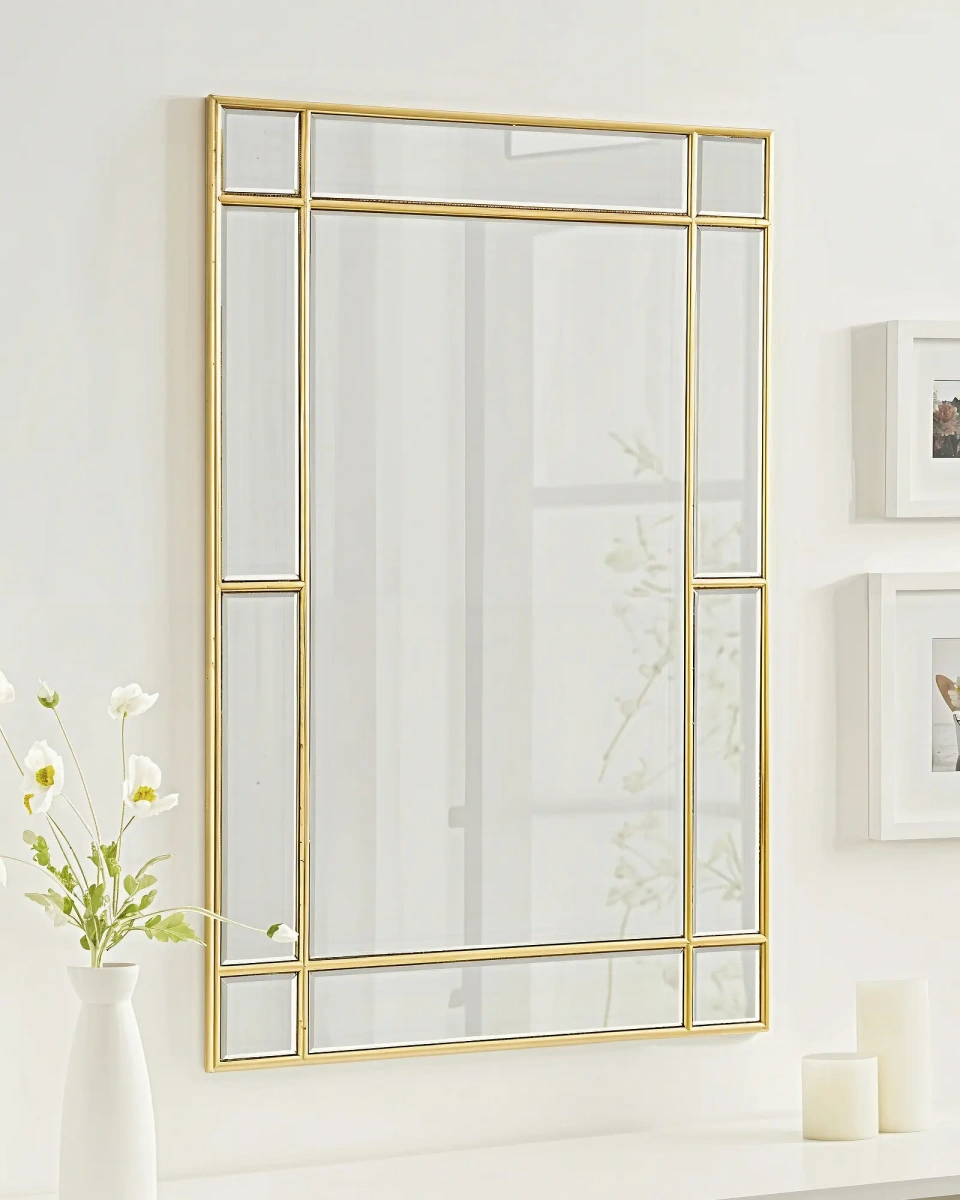 Зеркало в золотой раме "Триест" - это изысканное и стильное дополнение к любому интерьеру. Сочетание элегантности, практичности и функциональности делает это зеркало идеальным выбором для вашего дома. Ее разделяющая отделка и элегантный дизайн позволяют легко интегрировать зеркало в любое стилистическое решение интерьера. Благородный золотой цвет рамы подчеркнет ваш вкус и станет ярким акцентом в любом помещении. Строгая прямоугольная форма в сочетании с прямоугольными зеркальными элементами по периметру, создают визуальную интригу, притягивая взгляд и придавая пространству свет и объем. Это зеркало не только функциональный предмет, но и стильный декор, который преобразит ваш интерьер и добавит ему особую атмосферу уюта и комфорта. Особенность зеркала "Триест" заключается в его универсальности. Оно может быть установлено как вертикально, так и горизонтально в зависимости от вашего предпочтения и особенностей помещения. Это стильное и функциональное настенное зеркало "Триест" не только отражает изображение, но и создает атмосферу гармонии и уюта в вашем доме!