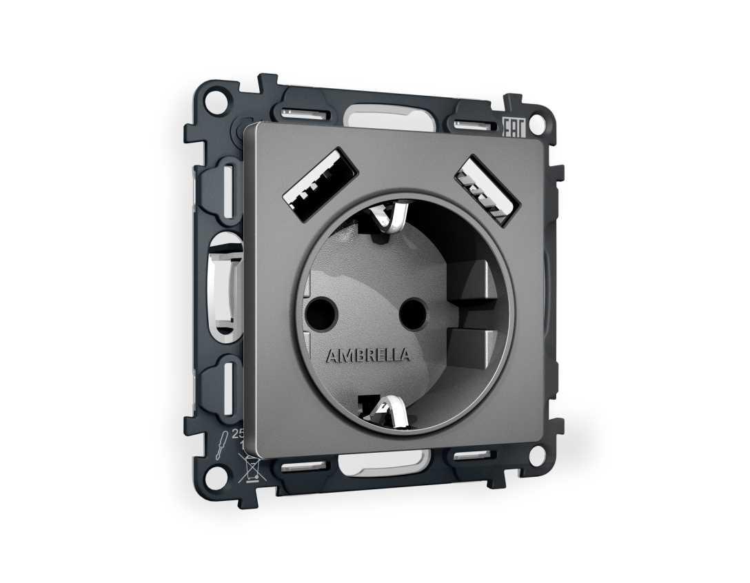 Комплект механизма электрической розетки AMBRELLA VOLT ALFA Антрацит серый 2USB A+A 18W (быстрая зарядка) с/з QUANT (AP6590, VM155) MA659010
