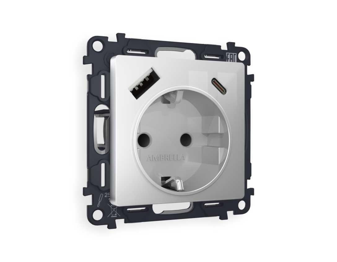 Комплект механизма электрической розетки AMBRELLA VOLT ALFA Серебро глянец 2USB A+C 20W (быстрая зарядка) с/з QUANT (AP4100, VM160) MA410010