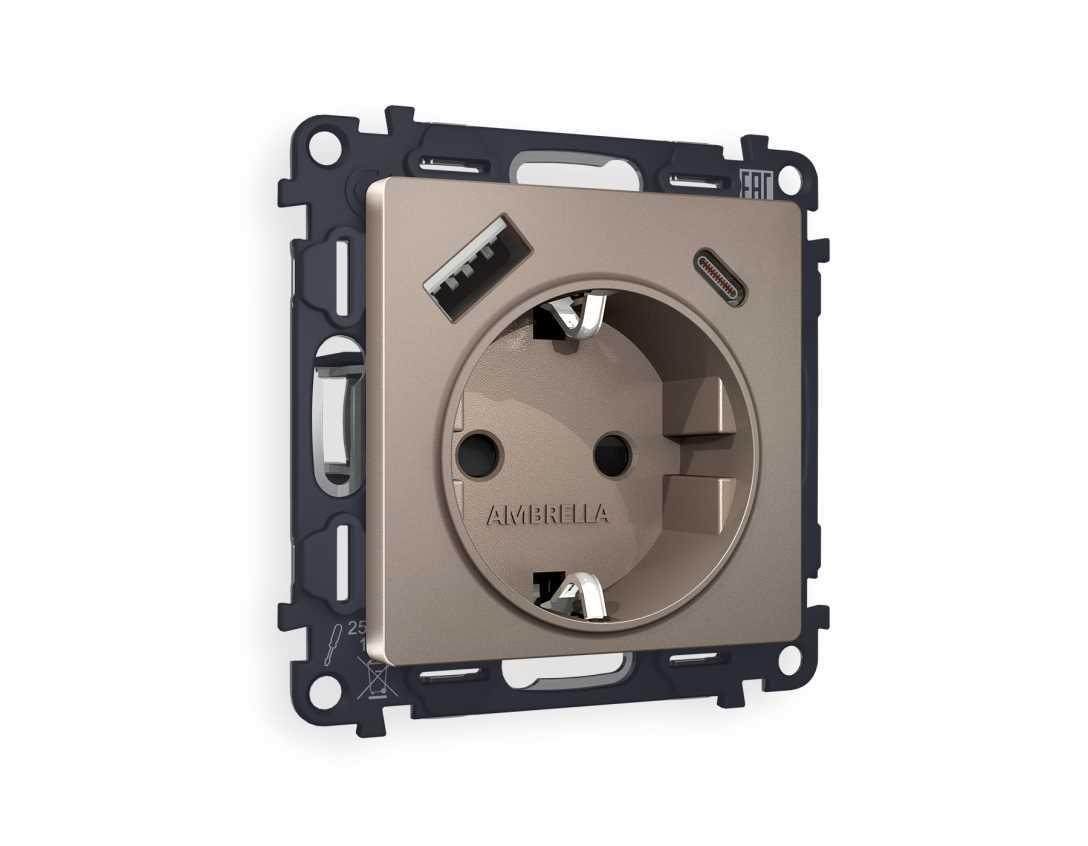Комплект механизма электрической розетки AMBRELLA VOLT ALFA Темная бронза матовый 2USB A+C 20W (быстрая зарядка) с/з QUANT (AP6400, VM160) MA640010