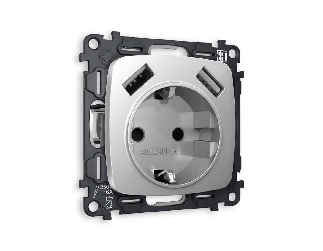 Комплект механизма электрической розетки AMBRELLA VOLT OMEGA Серебро глянец 2USB A+A 18W (быстрая зарядка) с/з QUANT (OP4090, VM155) MO409010