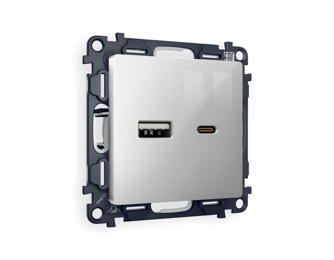 Комплект механизма розетки AMBRELLA VOLT ALFA Серебро глянец 2USB A+C 20W (быстрая зарядка) QUANT (AP4110, VM177) MA411010