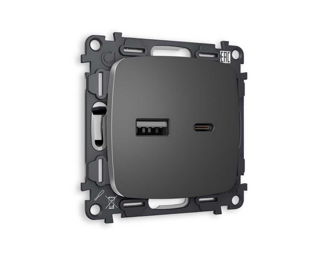 Комплект механизма розетки AMBRELLA VOLT OMEGA Антрацит серый 2USB A+C 20W (быстрая зарядка) QUANT (OP6610, VM177) MO661010