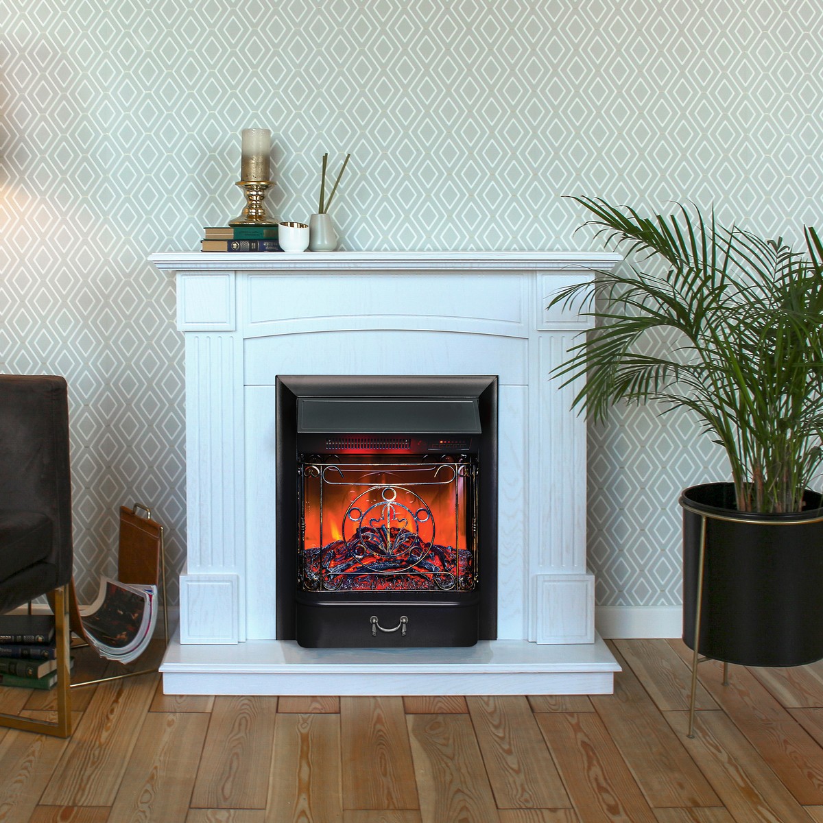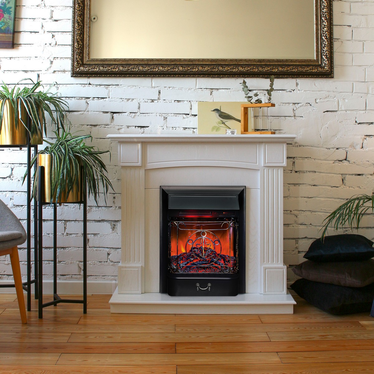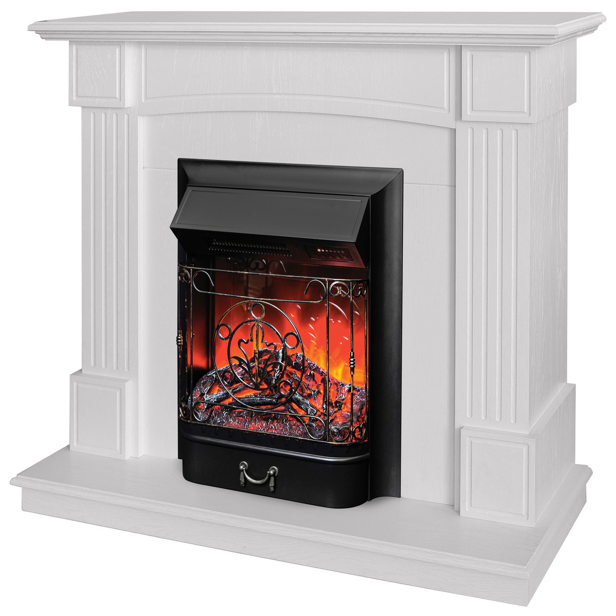 Каминокомплект ANDREA/АЛЬФА Беленый дуб с очагом Электроочаг MAJESTIC LUX RC/МАДЖЕСТИК С ПУЛЬТОМ