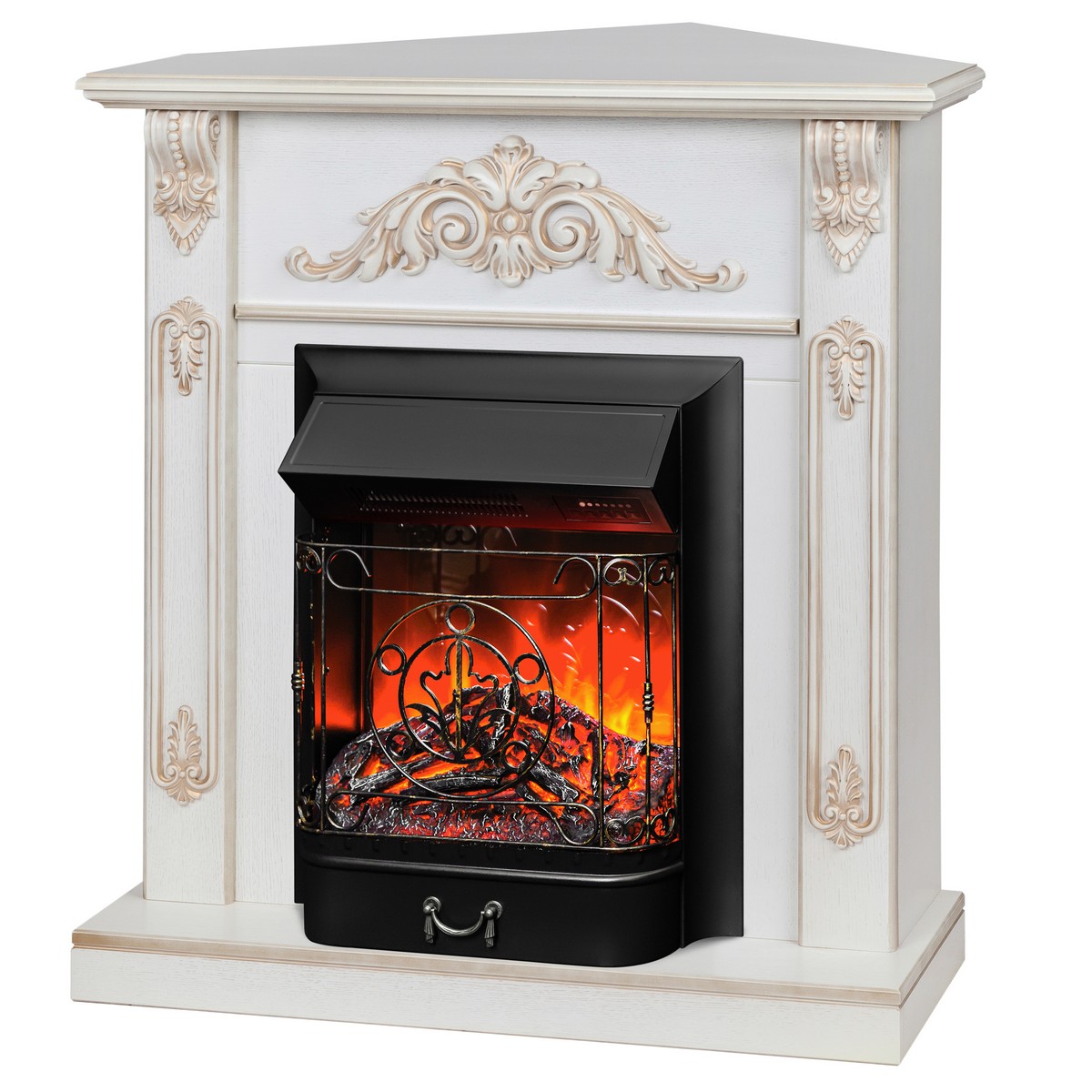 Каминокомплект ANITA CORNER/АНИТА УГЛ. Белый дуб с золотой патиной с очагом Электроочаг MAJESTIC LUX RC/МАДЖЕСТИК С ПУЛЬТОМ