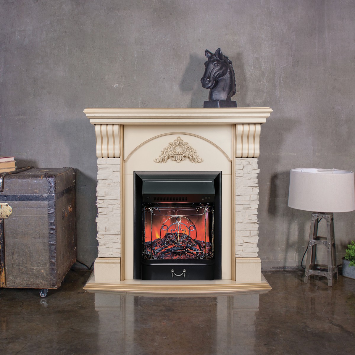 Каминокомплект ATHENA/АТЛАНТА Бежевый дуб с золотой патиной с очагом Электроочаг MAJESTIC LUX/МАДЖЕСТИК