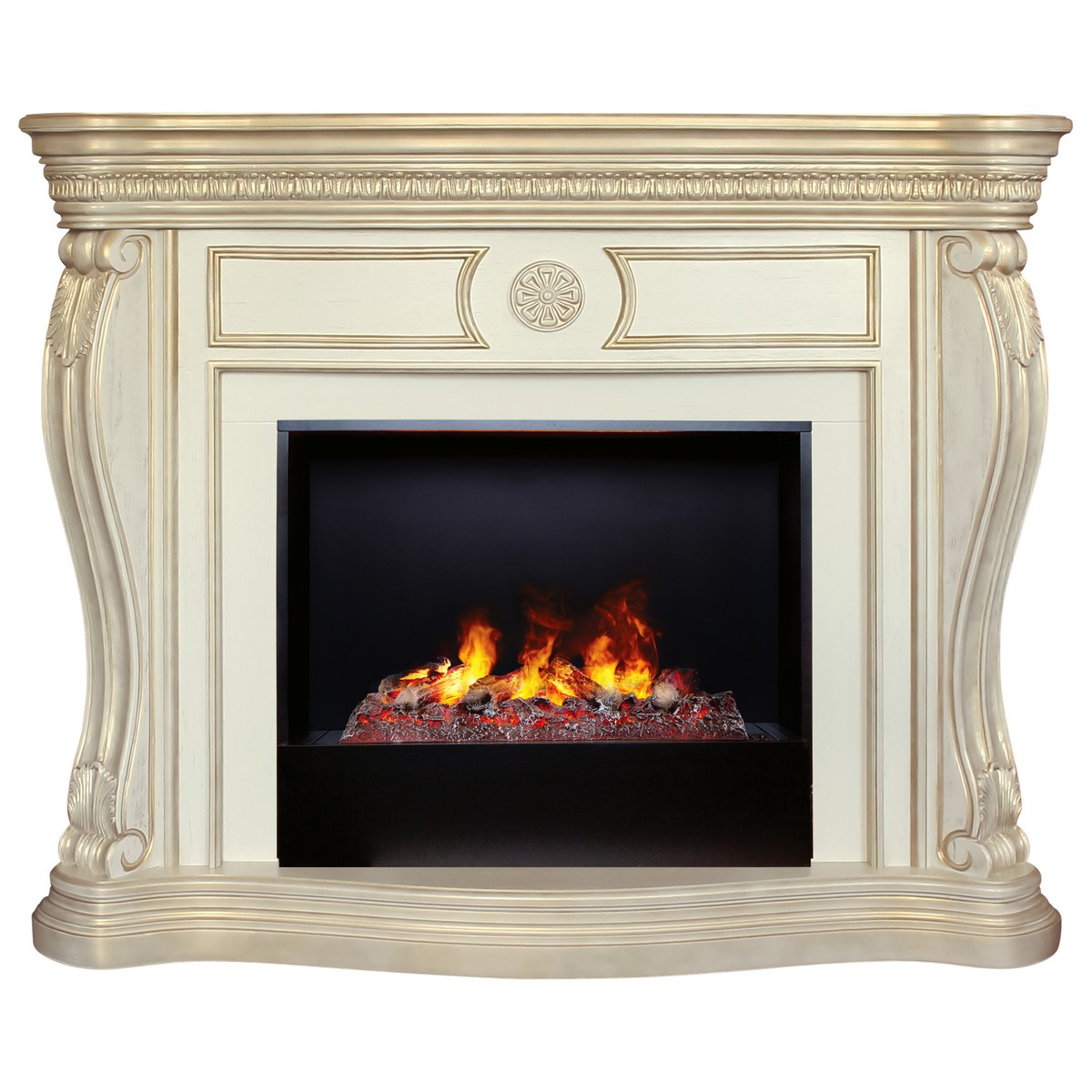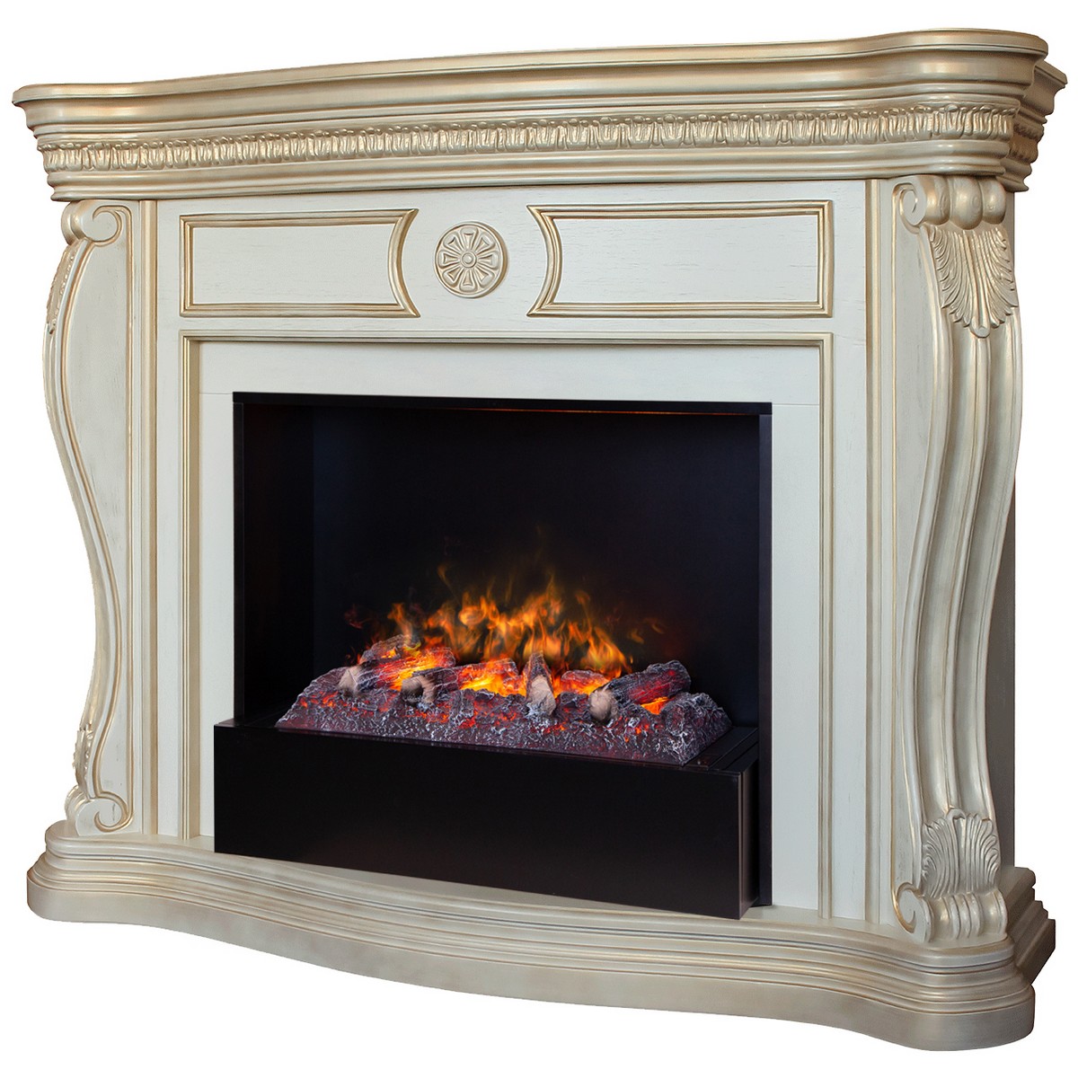 Каминокомплект BARCELONA/БАРСЕЛОНА Бежевый дуб с золотой патиной с очагом Электроочаг CASSETTE/КАССЕТА 630 С ДРОВАМИ