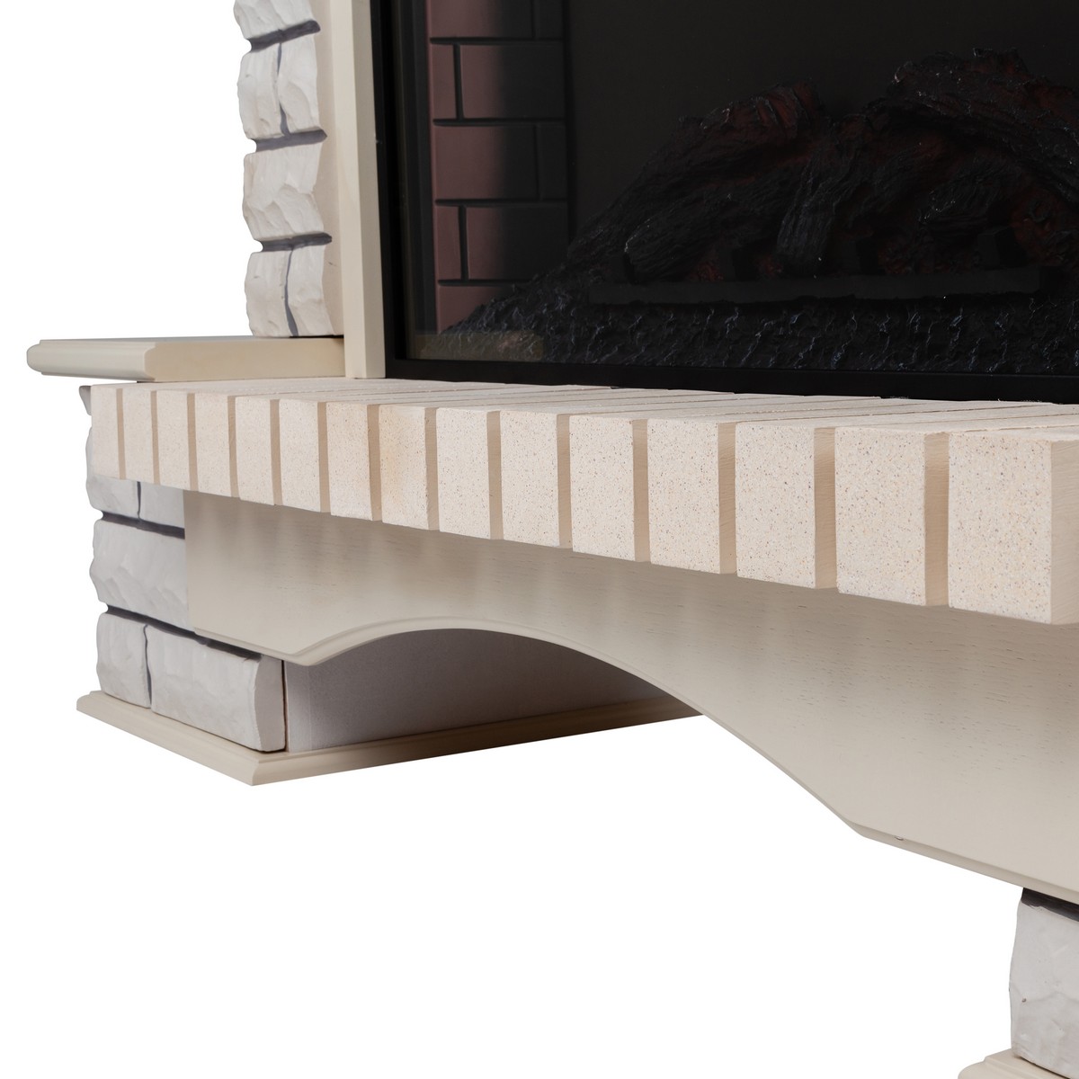 Обрамление в стиле ""Кантри"" изготовлено из искусственного камня и шпонированного МДФ. Цвет шпона - беленый дуб WT-614. Камень белого цвета. Очаг обладает функцией инфракрасного прогрева и звуковым эффектом потрескивания дров. Очень качественный и надежный очаг будет радовать вас не один год. Нагреватель спрятан в верхней части очага и обеспечивает обогрев в холодную погоду.