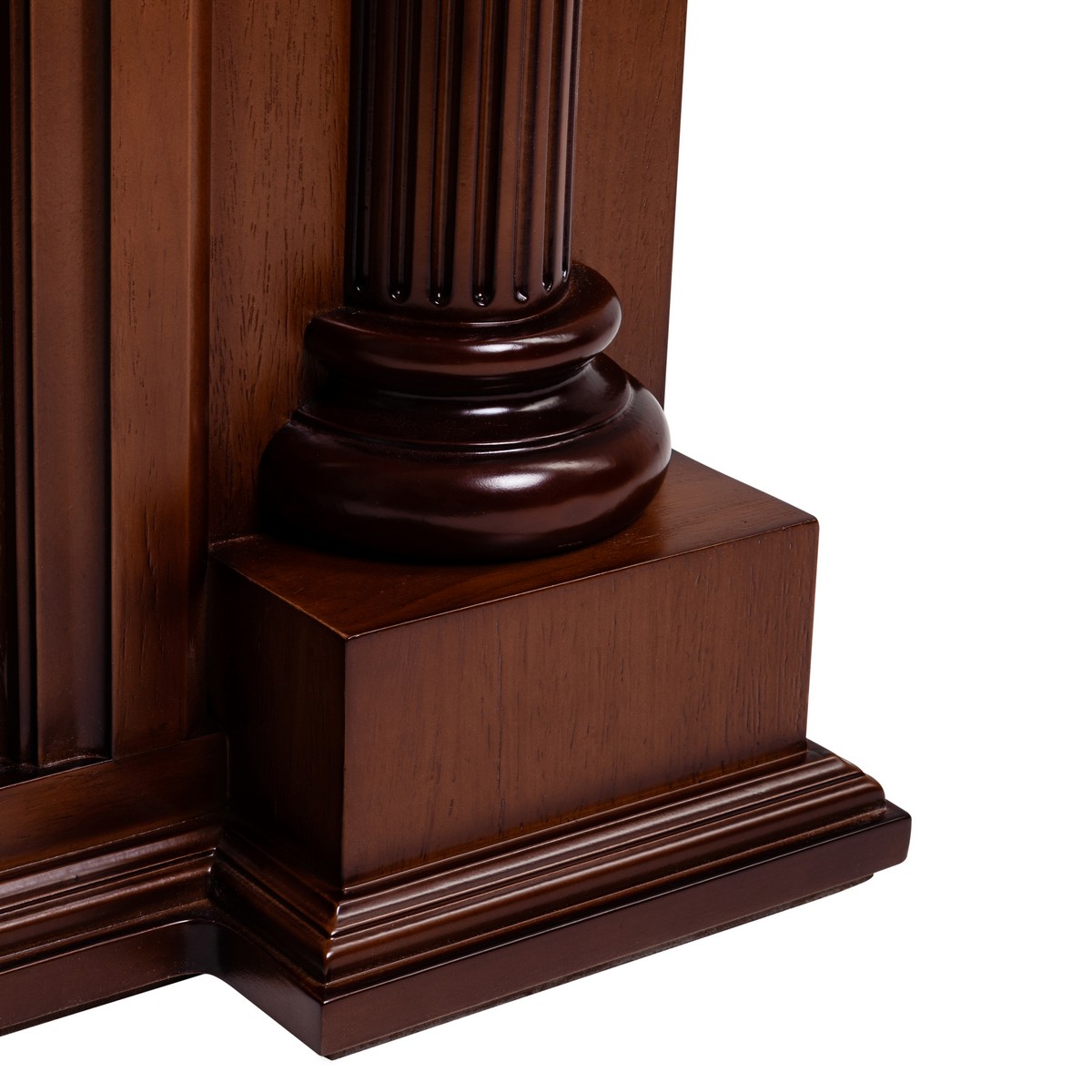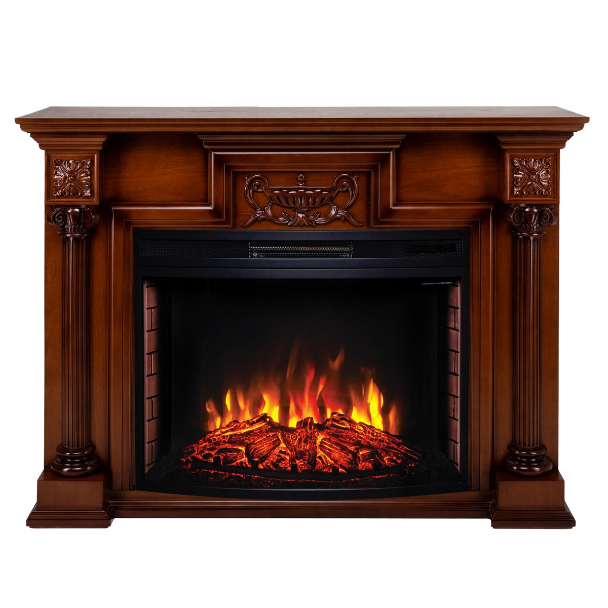 Электрический камин London с очагом Firespace 33 SIR. Изготовлен из шпонированного МДФ, цвет "античный дуб". Портал выполнен в классическом стиле. Украшен резьбой по дереву. Особенность очага - изогнутое панорамное стекло, прогрессивная технология инфракрасного обогрева.