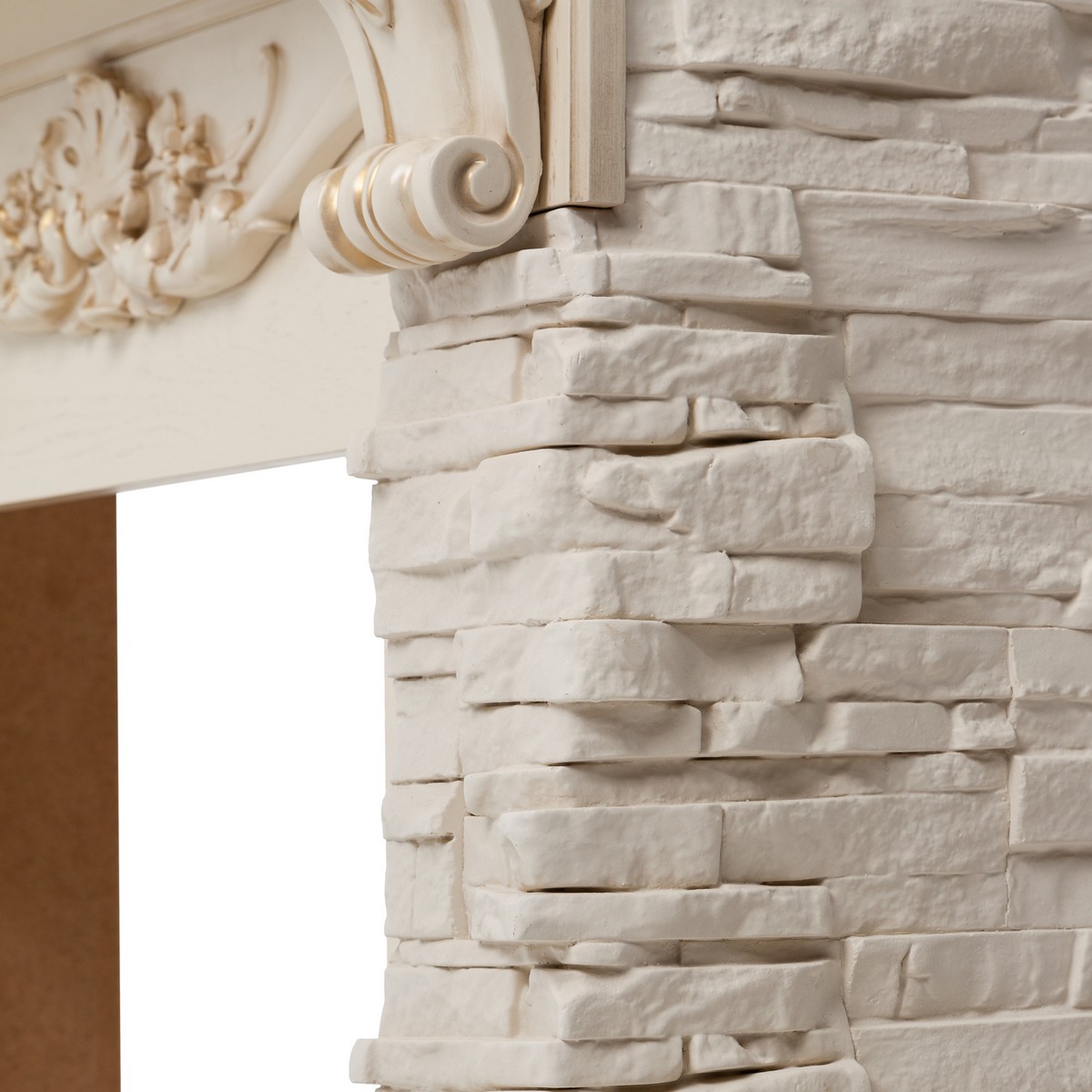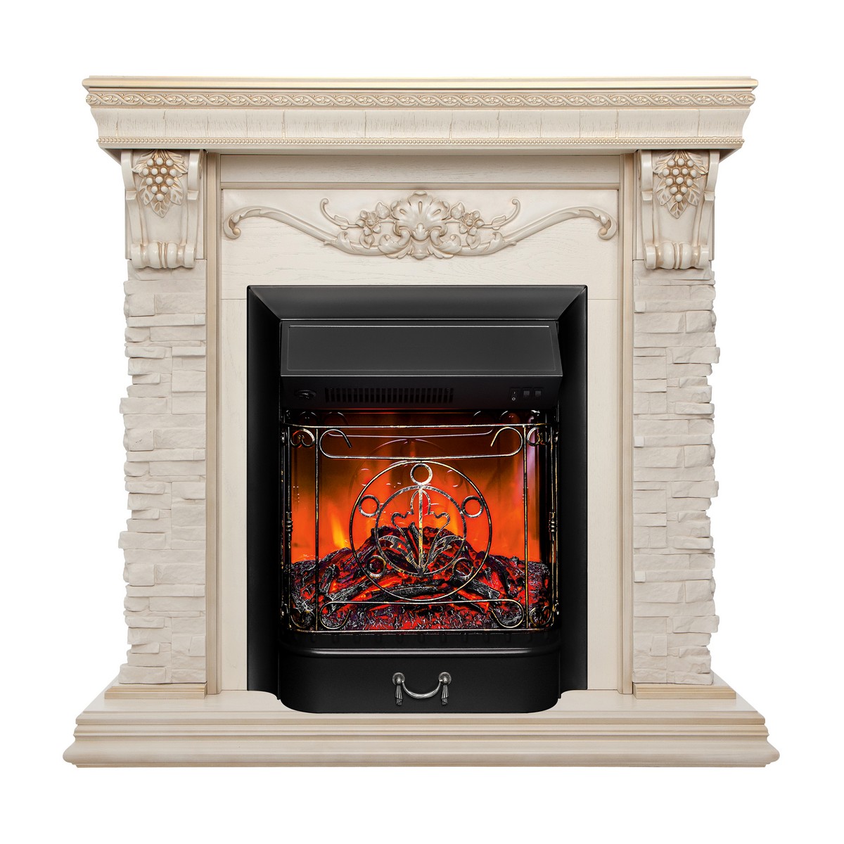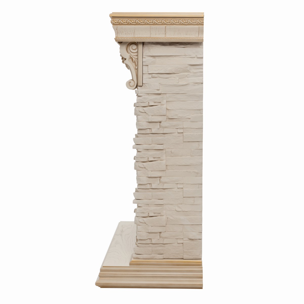 Каминокомплект PATRICIA/АДРИАНА Бежевый дуб с золотой патиной с очагом Электроочаг MAJESTIC LUX RC/МАДЖЕСТИК С ПУЛЬТОМ