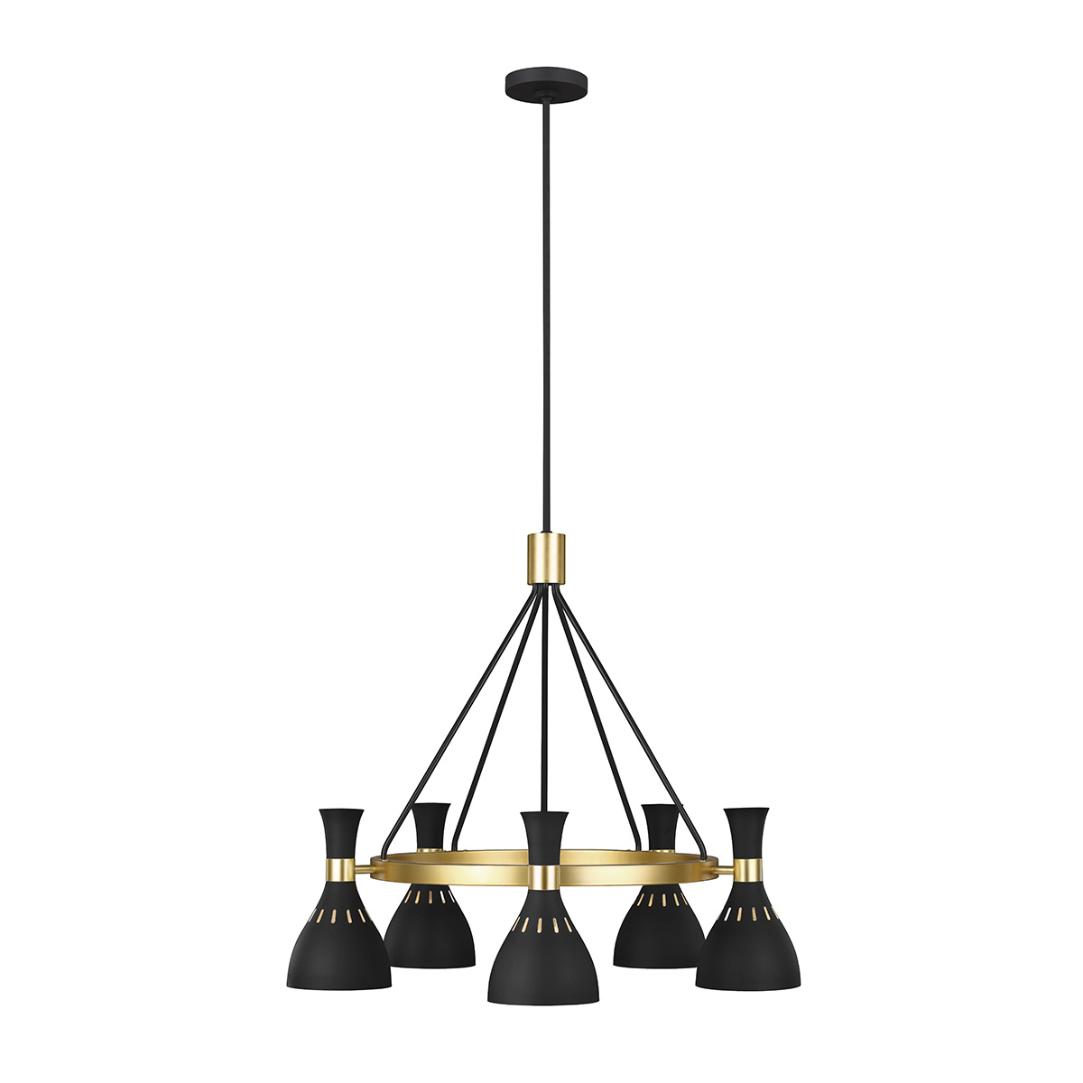 Люстра Elstead Lighting FE-JOAN5-MB. Геометрические линии. Культовые плафоны в форме песочных часов с узкими перфорированными отверстиями для мягкого рассеянного света. Основание в отделках - Черный, Латунь. Подходит для освещения гостинной, кухни, спальни, столовой. Поставляется со стержнями 4х305 мм и 1х152 мм