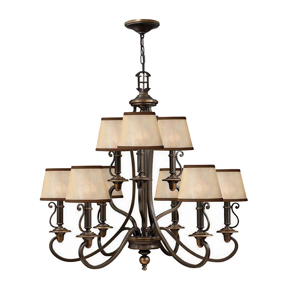 Люстра Elstead Lighting HK-PLYMOUTH9. Округлые ответвления, винтажные подсвечники и изогнутые литые элементы светильника дополнены нанесенной вручную отделкой и светло-янтарными абажурами из органзы (light amber organza). Классика никогда не выходит из моды. Основание выполнено в цвете - Бронза. Подходит для освещения гостинной, кухни, спальни, столовой. Цепь 3048 мм в комплекте