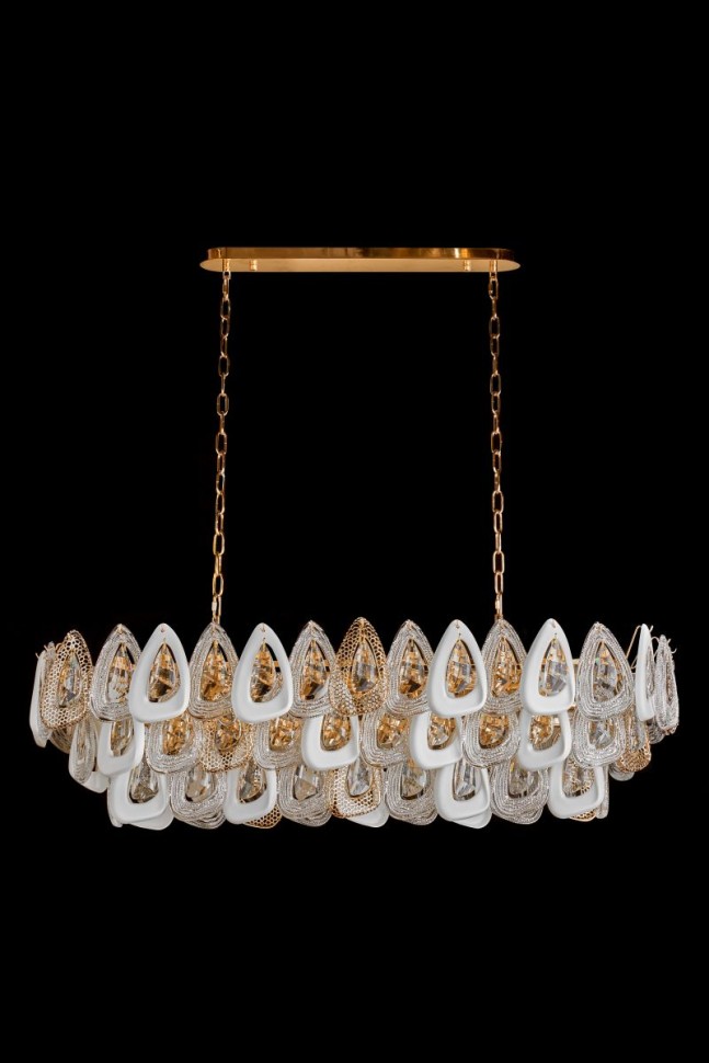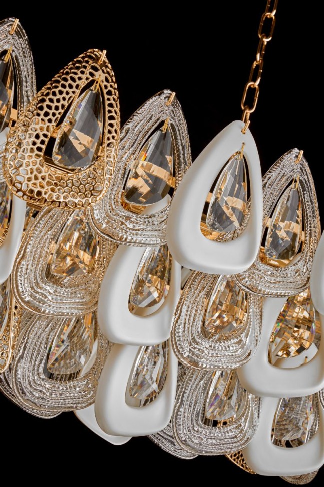 В переводе с итальянского название коллекции – «тонкость, изящество». Оно точно отражает утонченный характер дизайна светильников. Декоративные элементы плафонов выполнены в виде крупных капель из керамики и хрусталя высшего качества. Вместе они создают гармоничную элегантную композицию. Арматура светильников – из металла с гальваническим покрытием золотого цвета. Коллекция представлена люстрами различных размеров и форм и настенным светильником.