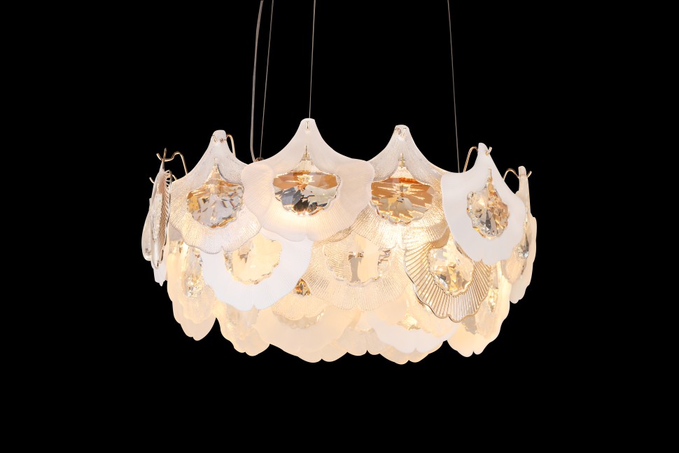 Плафоны выполнены из металла, керамики и стекла со вставками из натурального хрусталя самого высокого качества. Декоративные элементы плафонов создают завораживающую игру света и тени. Полупрозрачные пластины с волнистыми краями в виде лепестков мягко рассеивают каждый луч света, создавая нежное сияние. Коллекция включает в себя подвесные, потолочные люстры и бра разных размеров.