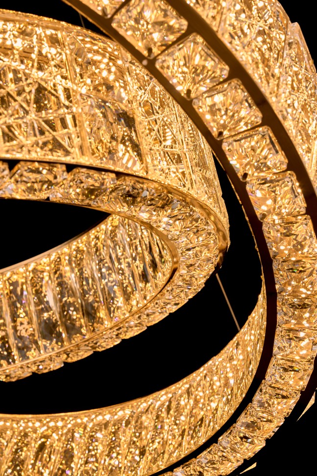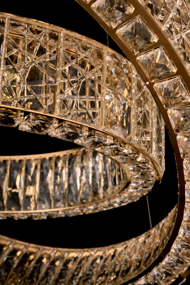 Впечатляющее сияние хрусталя подчеркнуто переливами корпуса светильника. Сложная, фантазийная огранка хрусталя, создает тысячи искрящихся переливов, виртуозную игру света. Корпус светильников - металл, гальваника цвета золото и хром. Источники света - встроенные светодиоды. Коллекция представлена люстрами различных форм и размеров и настенными бра в двух размерах.
