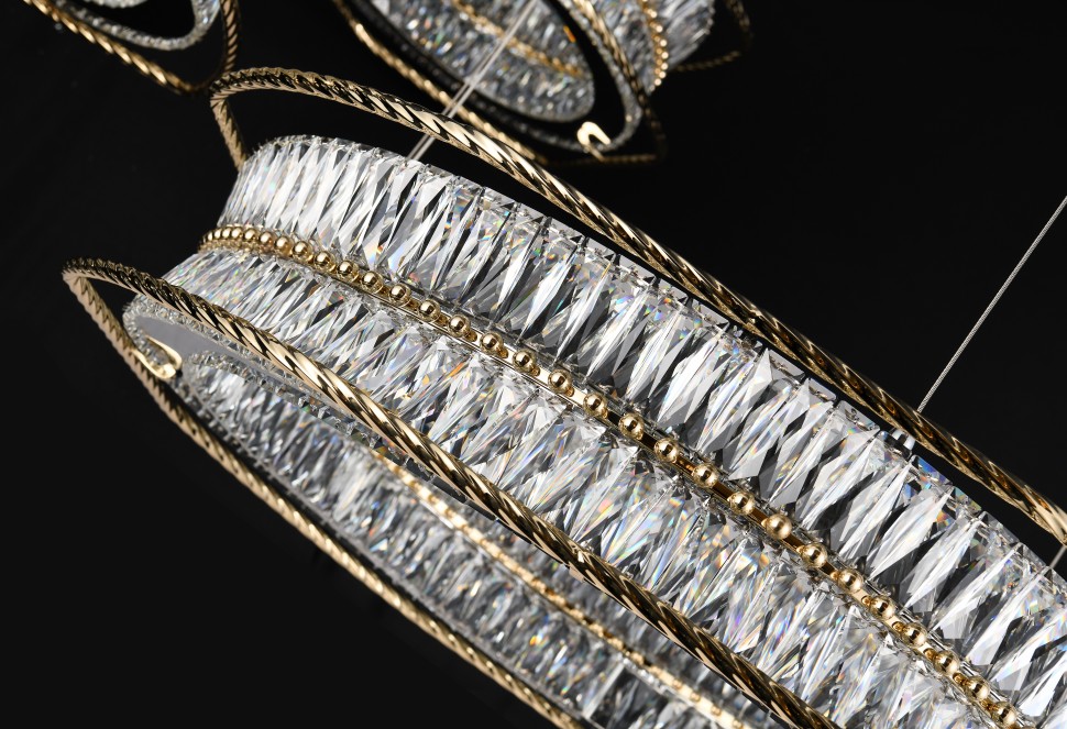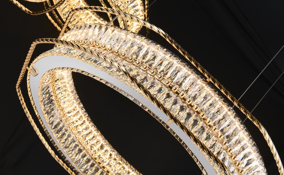Форма кольца и архитектурные линии отсылают к стилю ар-деко: элегантность, геометрия, лаконичность. Гальваническое покрытие арматуры придаёт изделию благородный блеск, а хрусталь завораживает игрой света. В интерьере такие люстры становятся не просто освещением, а центральным акцентом пространства.