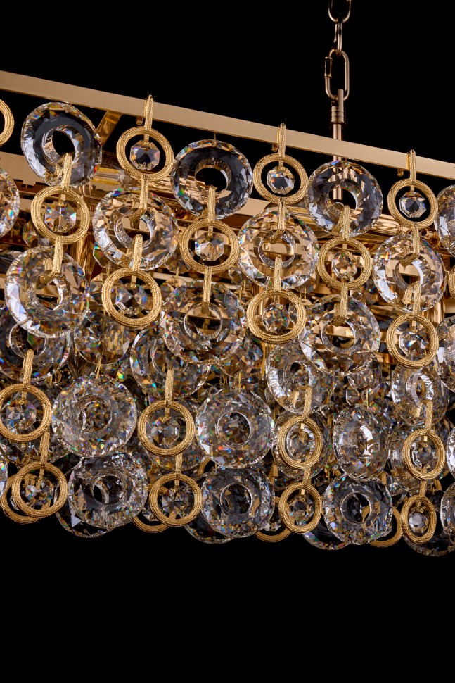 В переводе с итальянского название коллекции – «колокольчик». Светильники Campanella отличает нежный дизайн, имеющий сходство с этим красивым цветком. Декоративные элементы плафонов подвижны, как чашечки колокольчиков на ветру. Они выполнены из хрусталя высшего качества, в форме колец. Каждое кольцо имеет множество граней, невероятно эффектно отражающих свет. Хрустальные кольца дополнены кольцами из металла в цвете золота. Арматура светильников – из металла с гальваническим покрытием цвета золота. Коллекция представлена люстрами различных размеров и настенным светильником.