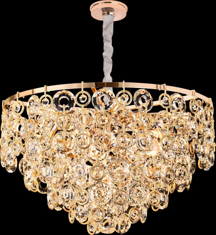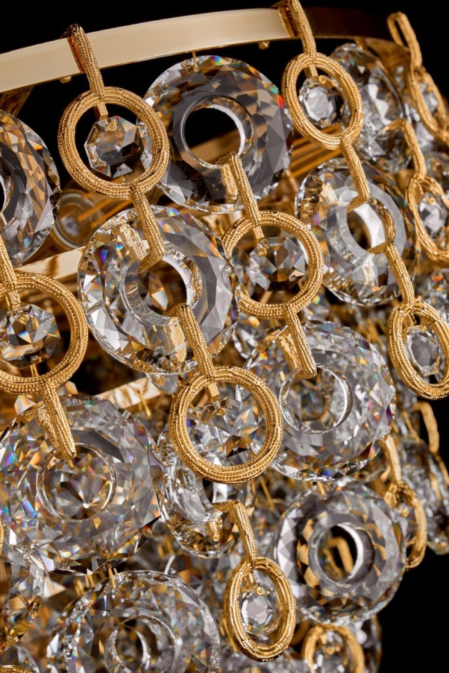 В переводе с итальянского название коллекции – «колокольчик». Светильники Campanella отличает нежный дизайн, имеющий сходство с этим красивым цветком. Декоративные элементы плафонов подвижны, как чашечки колокольчиков на ветру. Они выполнены из хрусталя высшего качества, в форме колец. Каждое кольцо имеет множество граней, невероятно эффектно отражающих свет. Хрустальные кольца дополнены кольцами из металла в цвете золота. Арматура светильников – из металла с гальваническим покрытием цвета золота. Коллекция представлена люстрами различных размеров и настенным светильником.