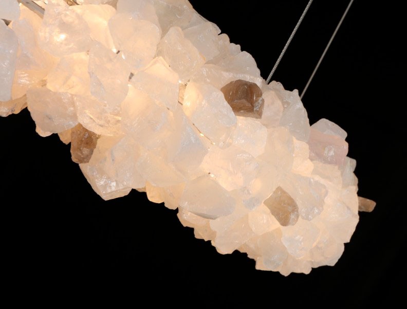 Изюминка дизайна коллекции – натуральный горный хрусталь с природной фактурой кристаллов. Плафоны люстр выполнены в виде гармоничных окружностей, усыпанных камнями горного хрусталя. Они словно парят в воздухе, переливаясь мягким естественным светом. Насыщенная текстура хрусталя создает волшебные переливы, а арматура цвета латуни подчеркивает элегантность дизайна.