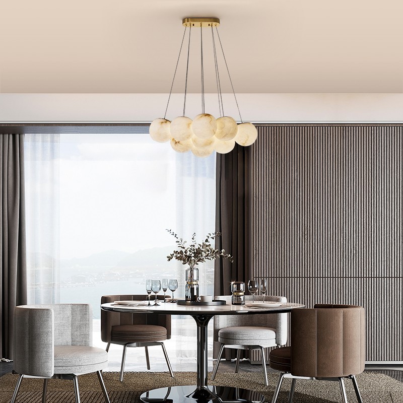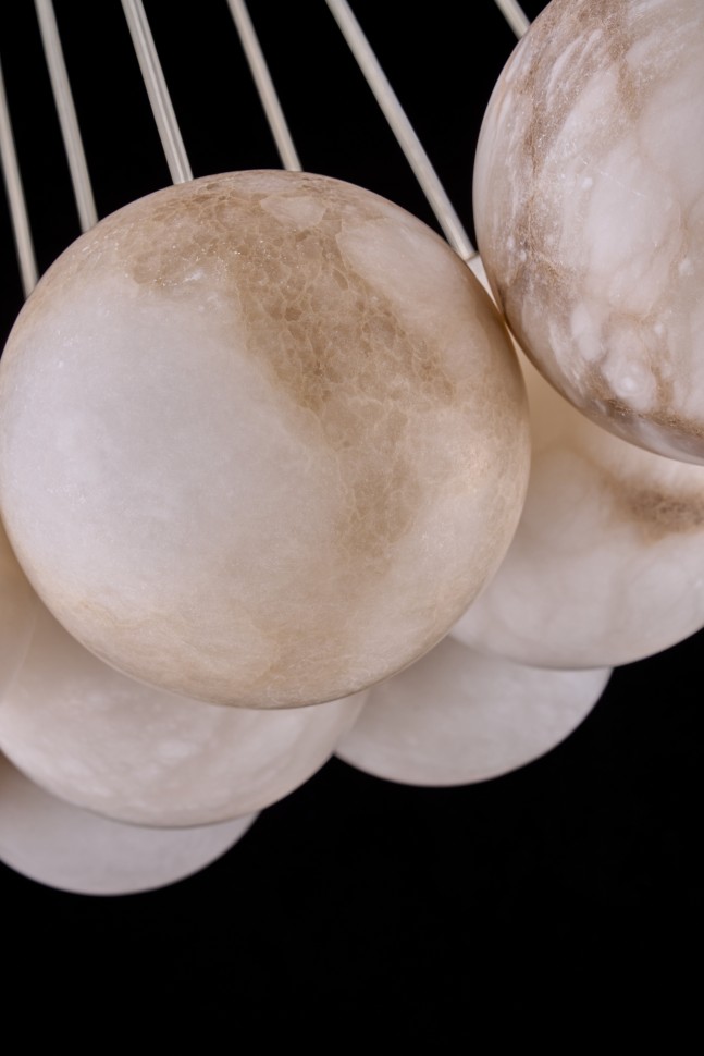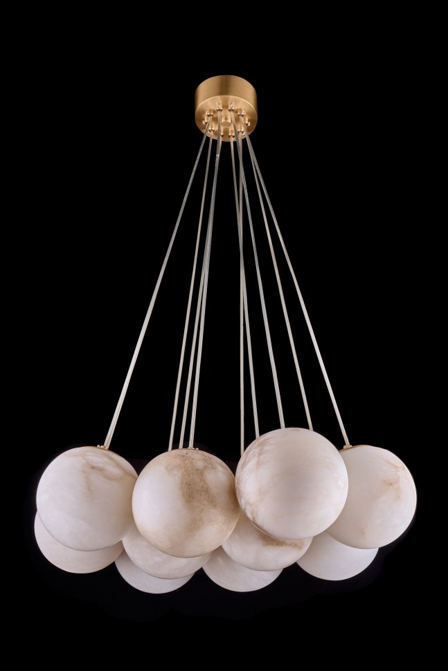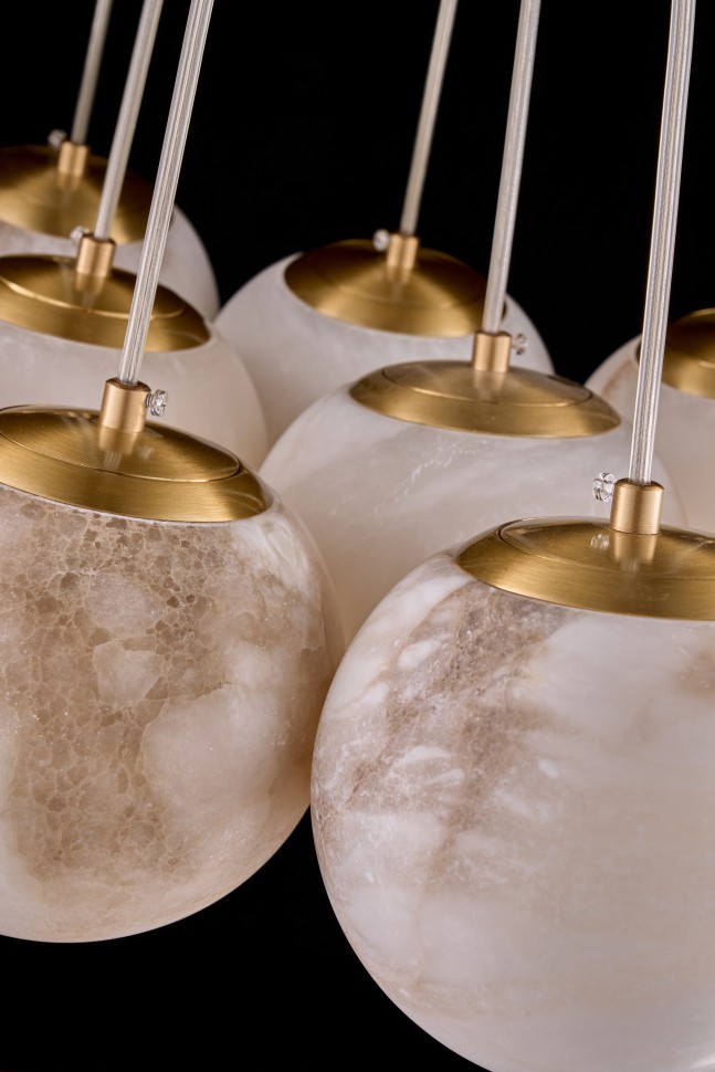 Плафоны выполнены из натурального камня - испанского алебастра. Корпус – из металла с гальваническим покрытием цвета латуни.